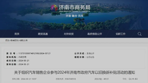 3月21日下午,记者从济南市商务局官网关注到,商务局发布了《关于组织汽车销售企业参与2024年济南市政府汽车以旧换新补贴活动的通知》,对有意愿参与以旧换新补贴活动的汽车新车销售企业进行征集报名。