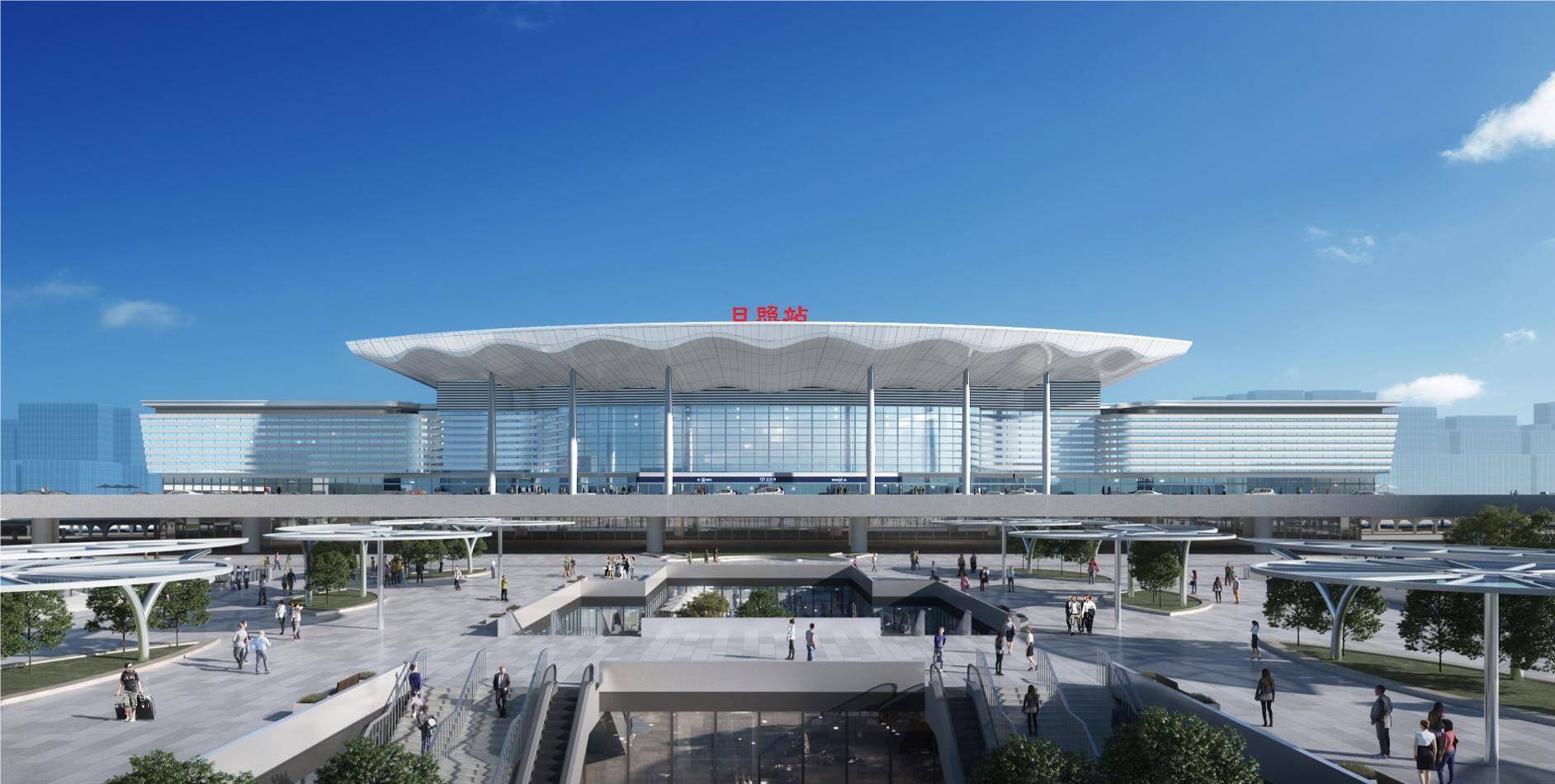 新建日照站位于既有日照站北侧,车场规模4台7线,站房分侧式和高架站房,采用上进下出站型,站房建筑面积43500平方米,新建站台雨棚23219平方米,旅客最高聚集人数可达4000人,为高架候车厅形式的综合性大型站房。新建站房造型以“碧海珍贝”为意向,融入贝壳的形态元素,结合现代的建筑设计手法,打造独具当地特色的新时代高铁站房,体现当地海滨特色。