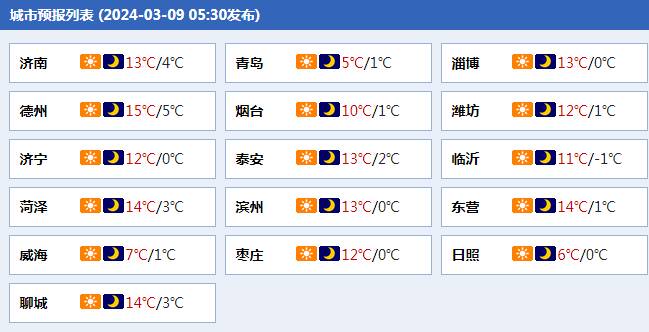 >>>10日白天到夜间,鲁西北、鲁中和半岛地区天气多云转阴局部有雷雨或阵雨,其他地区天气多云。南风,鲁中和半岛地区4~5级阵风6~7级,其他地区3~4级,雷雨地区雷雨时阵风7~9级。夜间最低气温:临沂、日照、鲁中山区和半岛内陆地区3℃左右,其他地区6℃左右。最高气温:济南、淄博北部、菏泽、济宁和鲁西北地区17℃左右,南部沿海地区10℃左右,其他地区13℃左右。