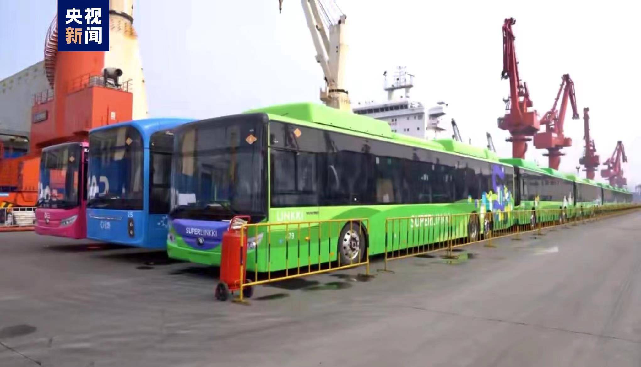 >>>8日,五十余辆新能源大巴在青岛港大港公司“天真”轮进行吊装作业,这是青岛港首批新能源大巴车出口装船。