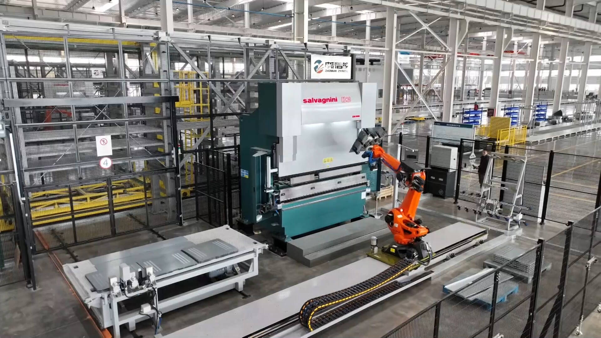 枣庄薛城融媒记者刘涵陈说:“新质生产力,新就新在用新技术创造新价值。我现在所在的位置就是中科智能(山东)有限公司的无人车间,大家看,这一条就是意大利进口的萨瓦尼尼生产线,工程师只需要调试好设备,从钢板到成本钣金件全部都是自行运转,真正实现了智能化生产。”