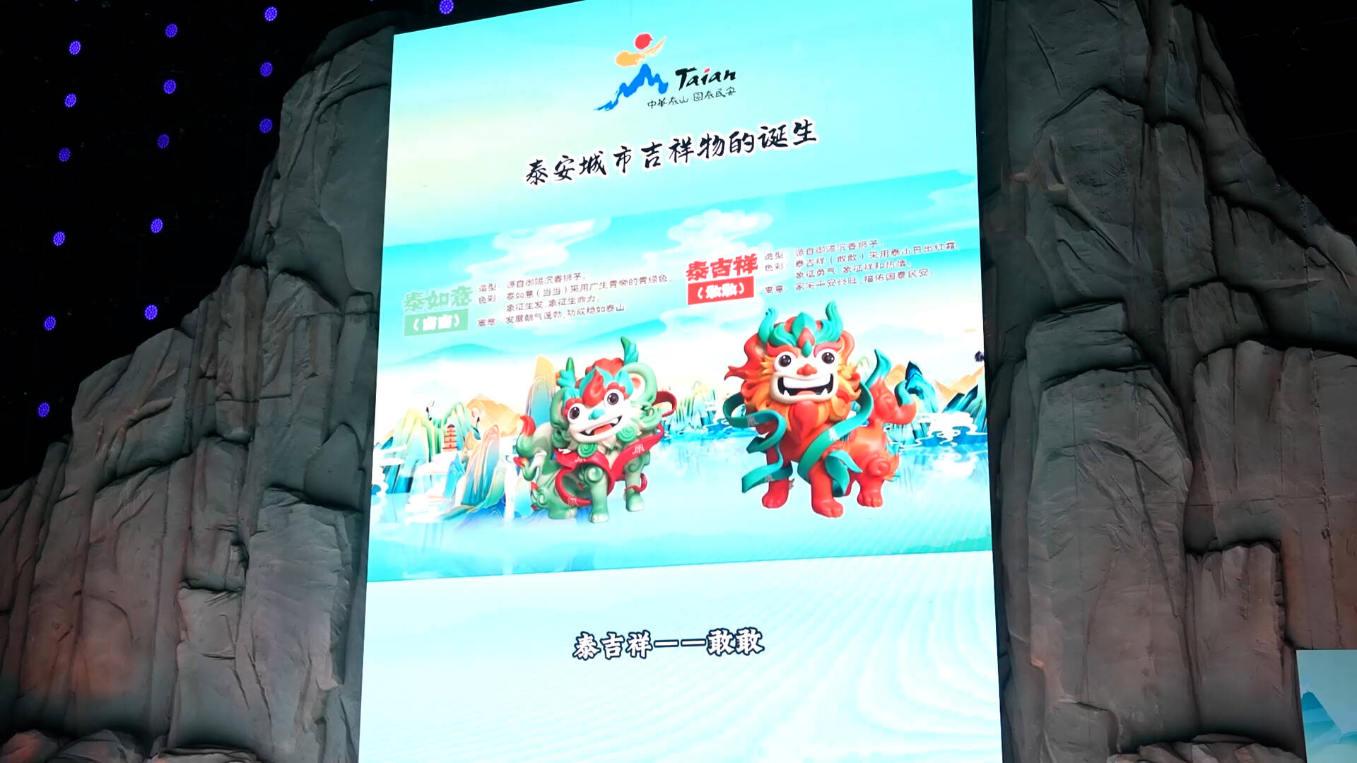 活动正式揭幕了体现泰安城市特色文化和精神风貌,承载城市形象品牌的城市吉祥物“敢敢”“当当”。据悉,城市吉祥物“敢敢”“当当”是泰山石敢当动物形象之一,这一命名体现了泰安人对“敢当”精神的执着追求。在设计造型上,“敢敢”“当当”采用了“泰山镇山三宝”之首——沉香狮子的造型,以大汶口象形符号帽翅、泰山鼻等体现泰山文化元素,绶带设计融入五岳真形图、泰山如意石刻等文化符号,体现了博大精深的泰山文化。在色彩应用上,“敢敢”采用泰山日出红霞,象征勇气、祥和、热情,“当当”采用广生青帝的青绿色,象征生发和生命力。在纹饰设计上,“敢敢”身体采用祥云纹饰,“当当”采用山水纹饰,展现泰山、大汶河自然生态元素。