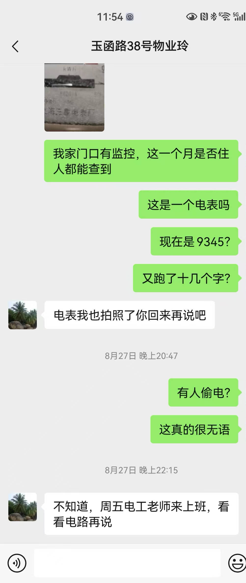 此外,马女士还表示,当时收到物业工作人员的通知时,便联系邻居去查看了自己家的电表,也发现了问题。“当时因为我人在国外,就赶紧给邻居说,邻居上我家去看了一下,比较懂的邻居说应该是物业把公共用电,接在了我家的电表上。”