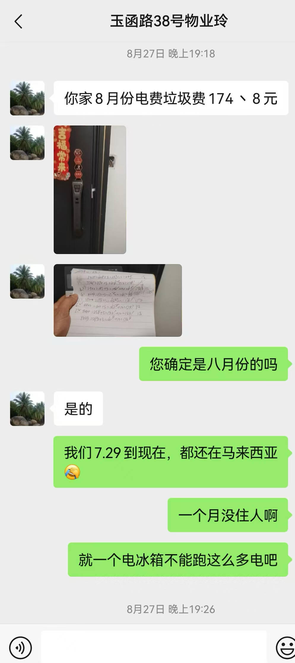 济南市玉函路38号院业主马女士:“我7月30号带着家人就出国了,到了8月27号,物业这边抄表,说我家加上10来块钱的卫生费,加上电费一共是170多块钱。我当时就有点蒙,我说我7月底就带着老人和孩子出去了。这一个月家里边就有一个冰箱,就连电动马桶我都给拔下来了,热水器这些东西我全都关掉了。”