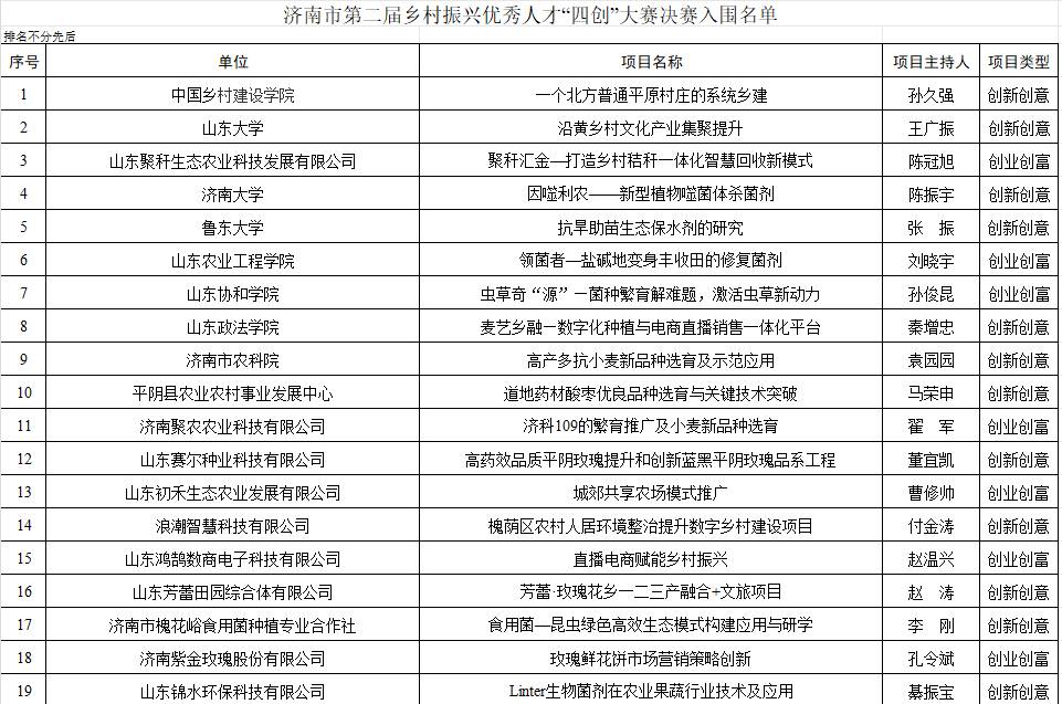 齐鲁网·闪电新闻10月11日讯 记者从济南市农业农村局获悉,经过激烈的角逐,济南市第二届乡村振兴优秀人才创新创意创业创富大赛决赛入围名单已出。
