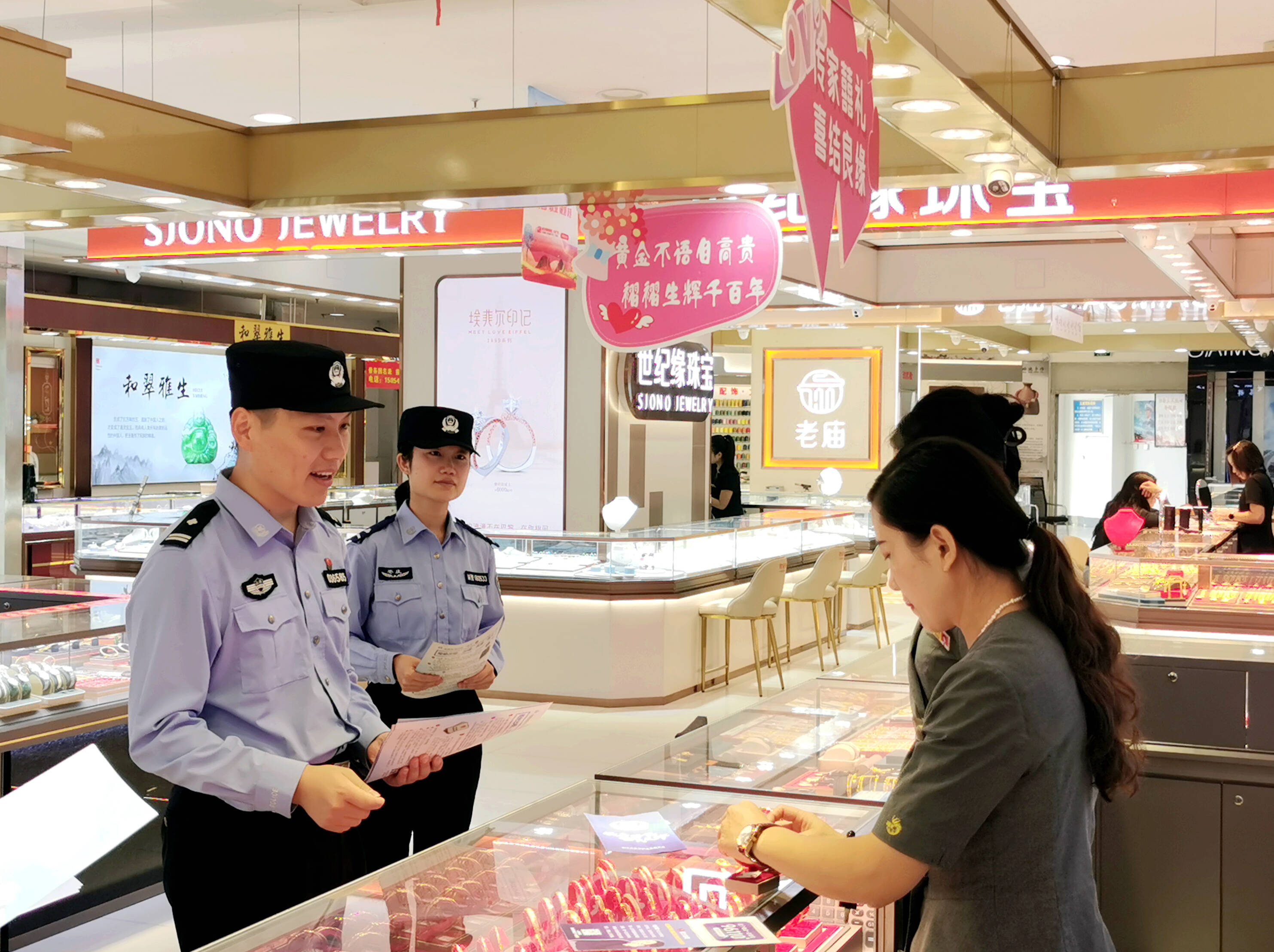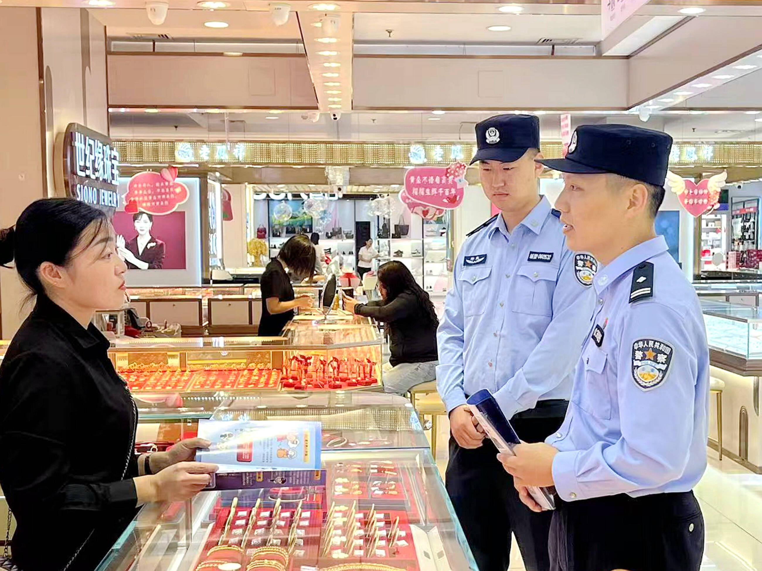 近期,电诈手法不断迭代升级,“线上诈骗+线下取现”的模式增多。枣庄市公安局山亭分局合成作战中心民警辅警结合发生在黄金珠宝行业的洗钱诈骗案件,通过发放宣传资料的方式,面对面向金店销售人员和购物群众讲解黄金洗钱的常见手段和防范方法,提醒大家要提升防范意识和防骗能力,避免成为诈骗洗钱的“工具人”。