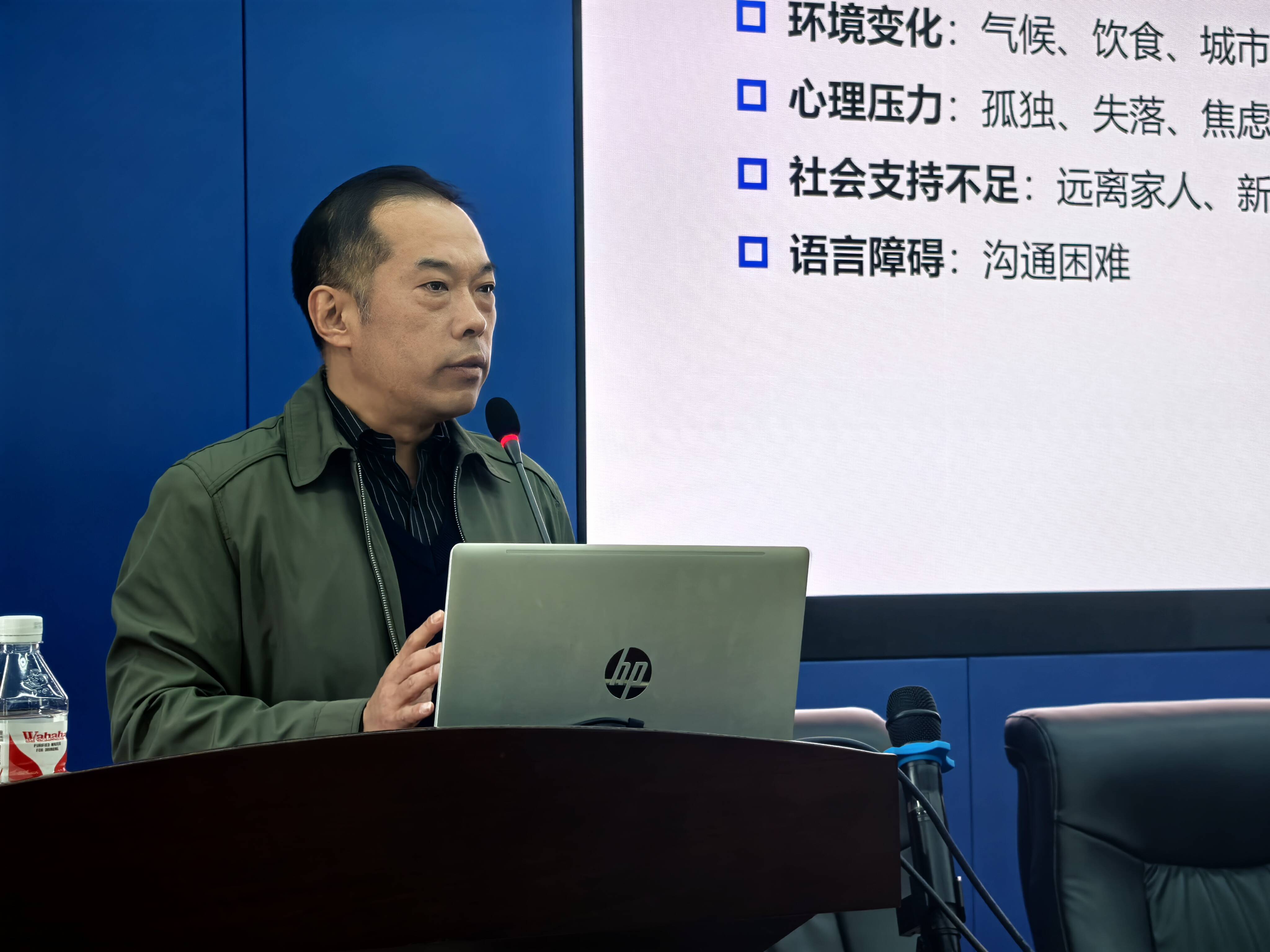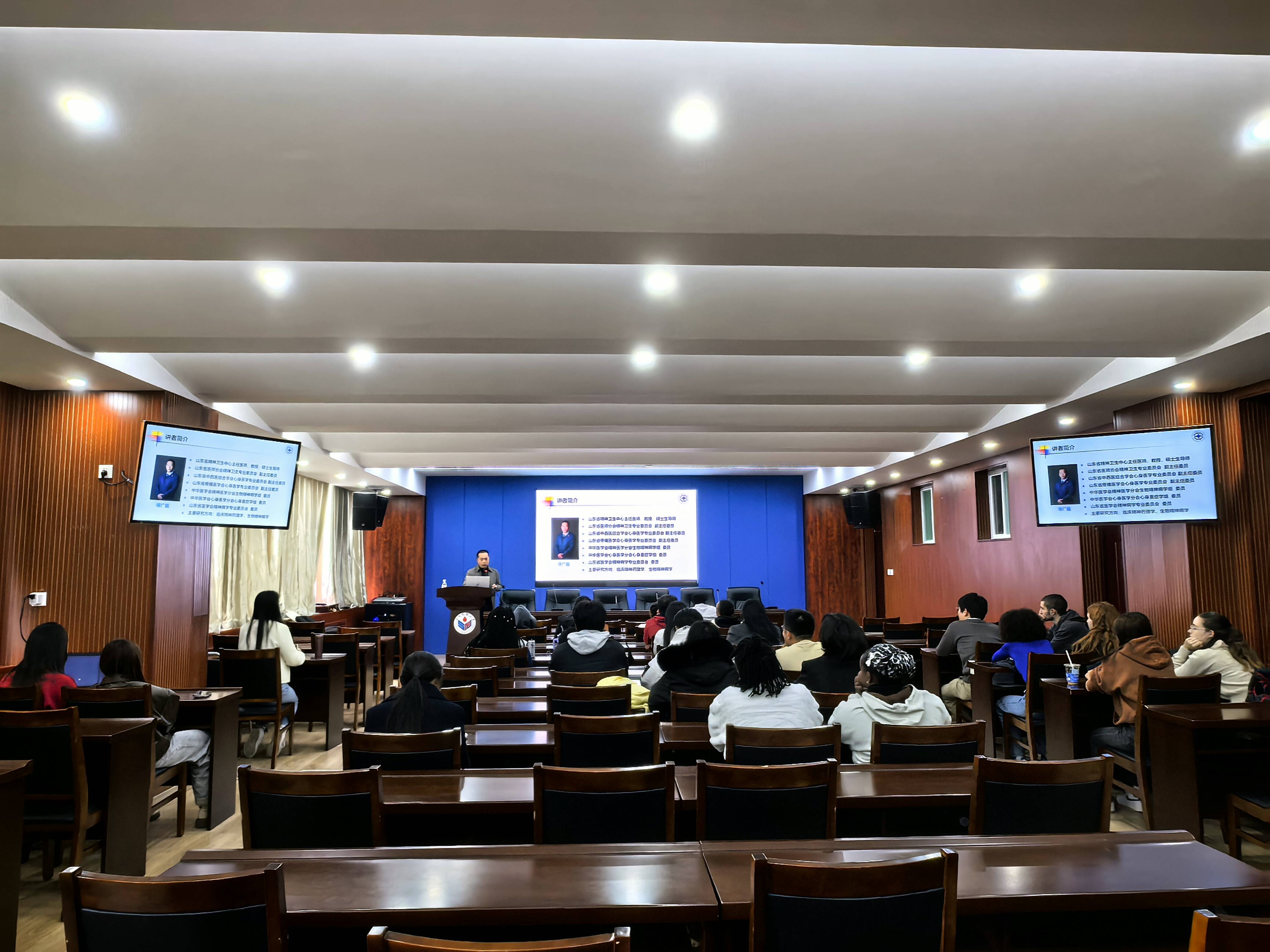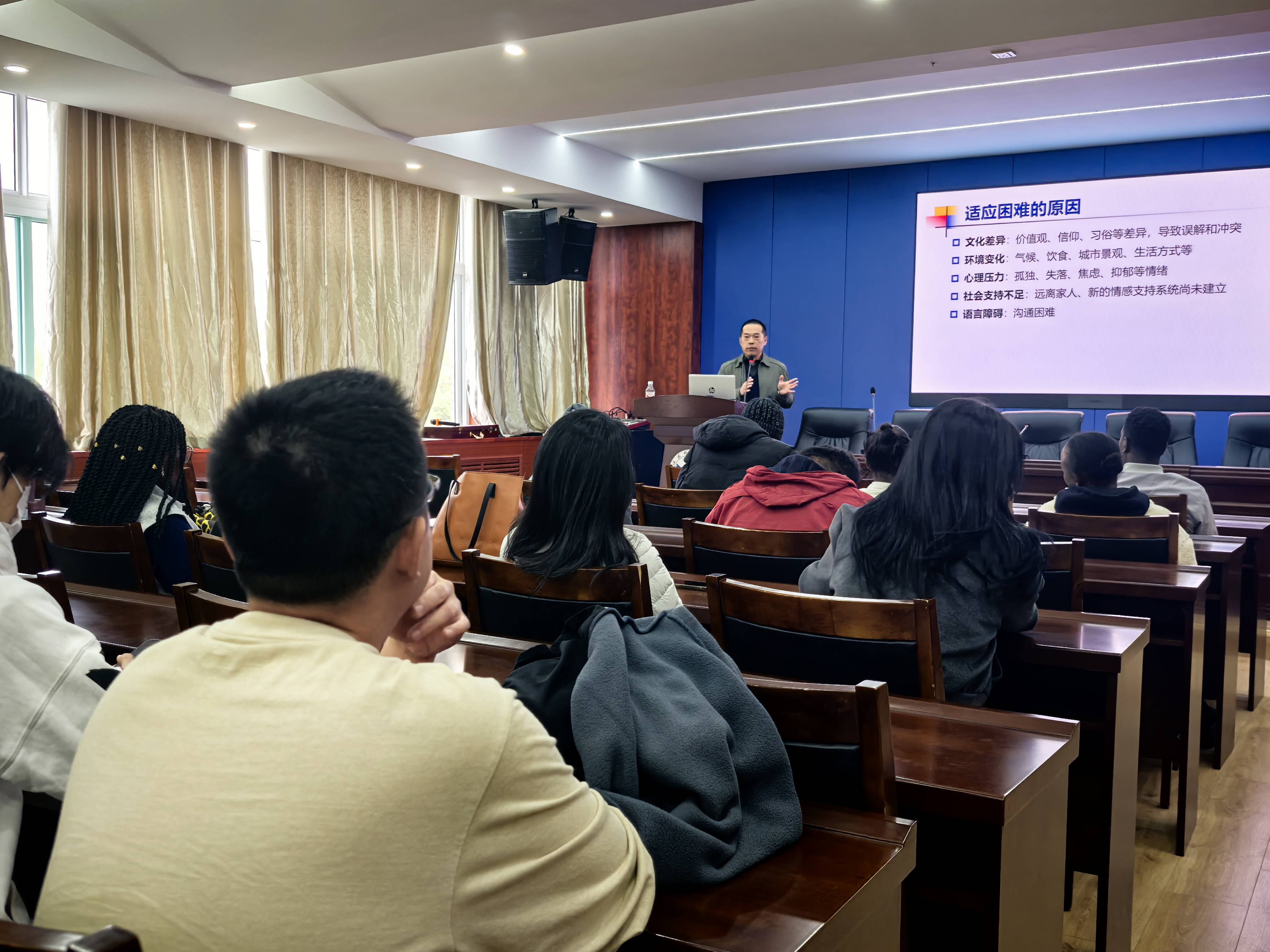 这次心理健康课由山东省精神卫生中心寻广磊主任进行主讲,围绕国际教育学院新生可能遇到的各种心理问题展开。他首先介绍了文化冲击的概念和影响,帮助新生们理解在异国他乡可能遇到的文化差异和适应困难。接着又详细讲解了学习压力、人际交往、生活适应等方面的心理问题,并提供了实用的心理调适方法和技巧。