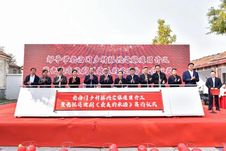 齐鲁网·闪电新闻10月30日讯 10月29日,邹平市老西门乡村振兴文旅项目开工暨电视连续剧《最美的承诺》签约仪式在黛溪街道西关村村委举行。老西门乡村振兴文旅项目是由中尽国际控股集团有限公司和邹平市黛溪街道共同筹建的乡村振兴文旅项目,项目总投资5.5亿元,占地面积349045.3m²,涉及西关村、三义村、河西张村、代一村4个村,是黛溪街道招商引资的重点项目。