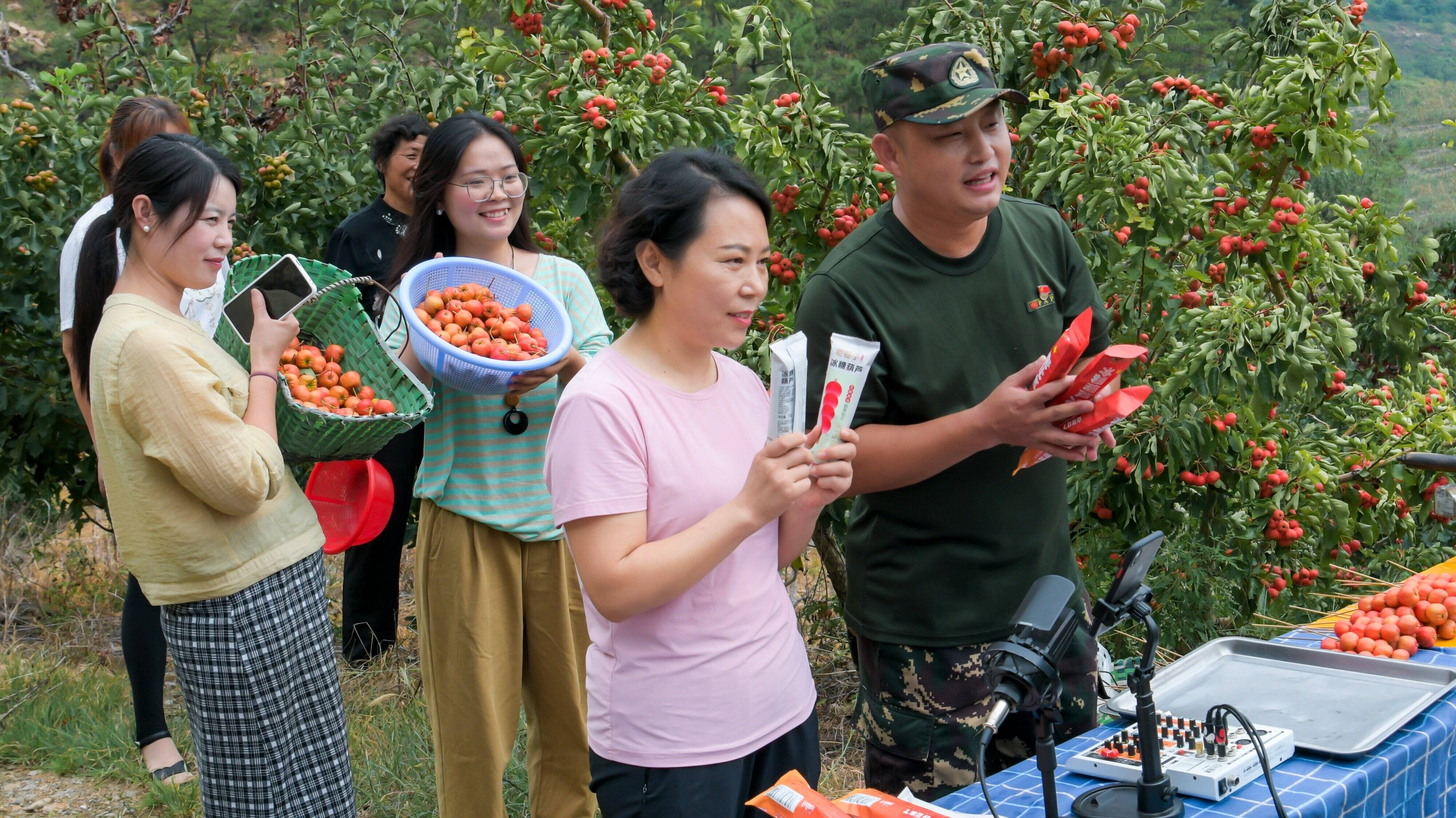 “老铁们,家人们,我们张家棚的山好水好,这里的山楂个头大、颜色好、口感好,山楂虽然酸,但是酸中有甜,今年特殊的气候,农民朋友很辛苦……”山东省劳模华明芹在直播时说。