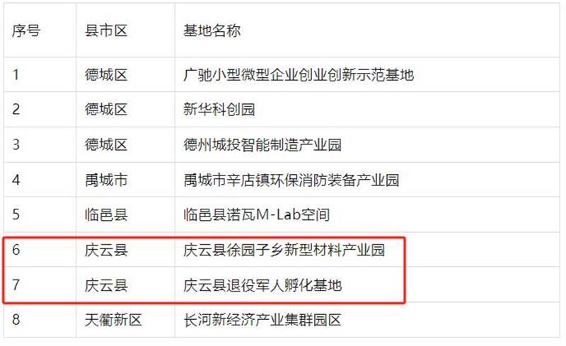 近日,德州市工信局公示了2024年度德州市小型微型企业创业创新示范基地名单,庆云县徐园子乡新型材料产业园和庆云县退役军人孵化基地成功入选,德州共8家。