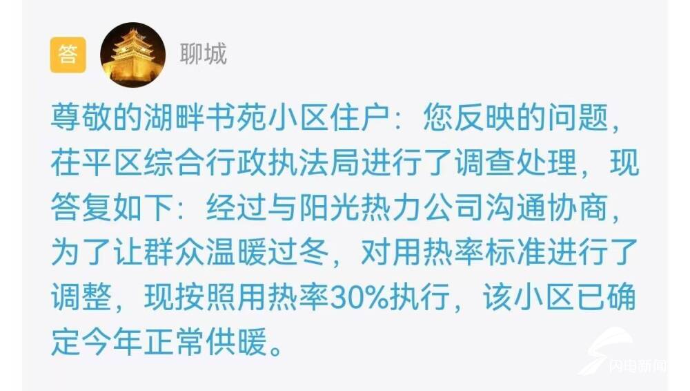 收到留言后,茌平区综合行政执法局进行了调查处理,经过与阳光热力公司沟通协商,为了让群众温暖过冬,对用热率标准进行了调整,现按照用热率30%执行,已确定今年正常供暖。