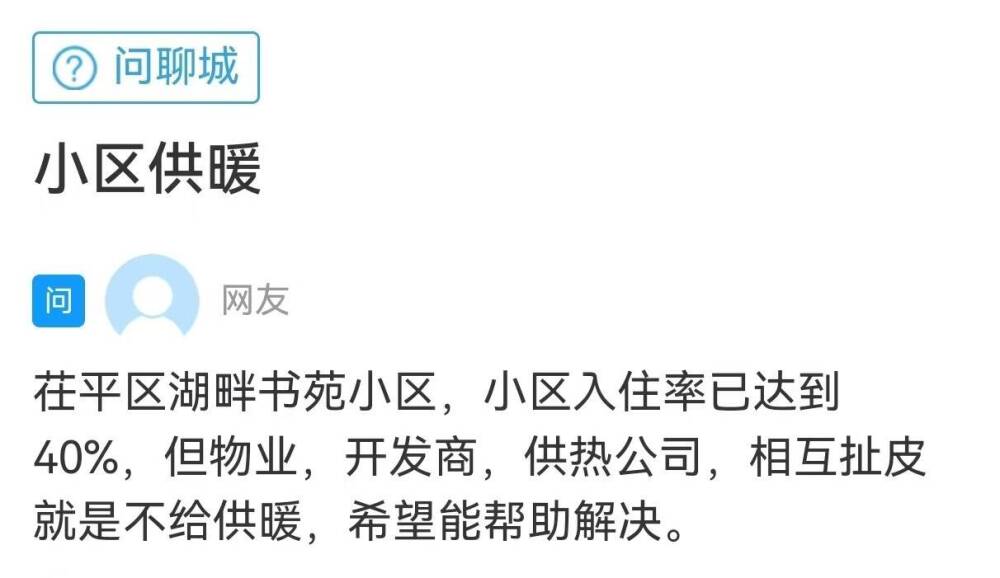齐鲁网·闪电新闻11月22日讯 聊城的一位网友在《问政山东》网络问政平台留言说,茌平区湖畔书苑小区的入住率已达到40%了,但物业、开发商和供热公司,相互推脱就是不给供暖,希望能帮助解决。