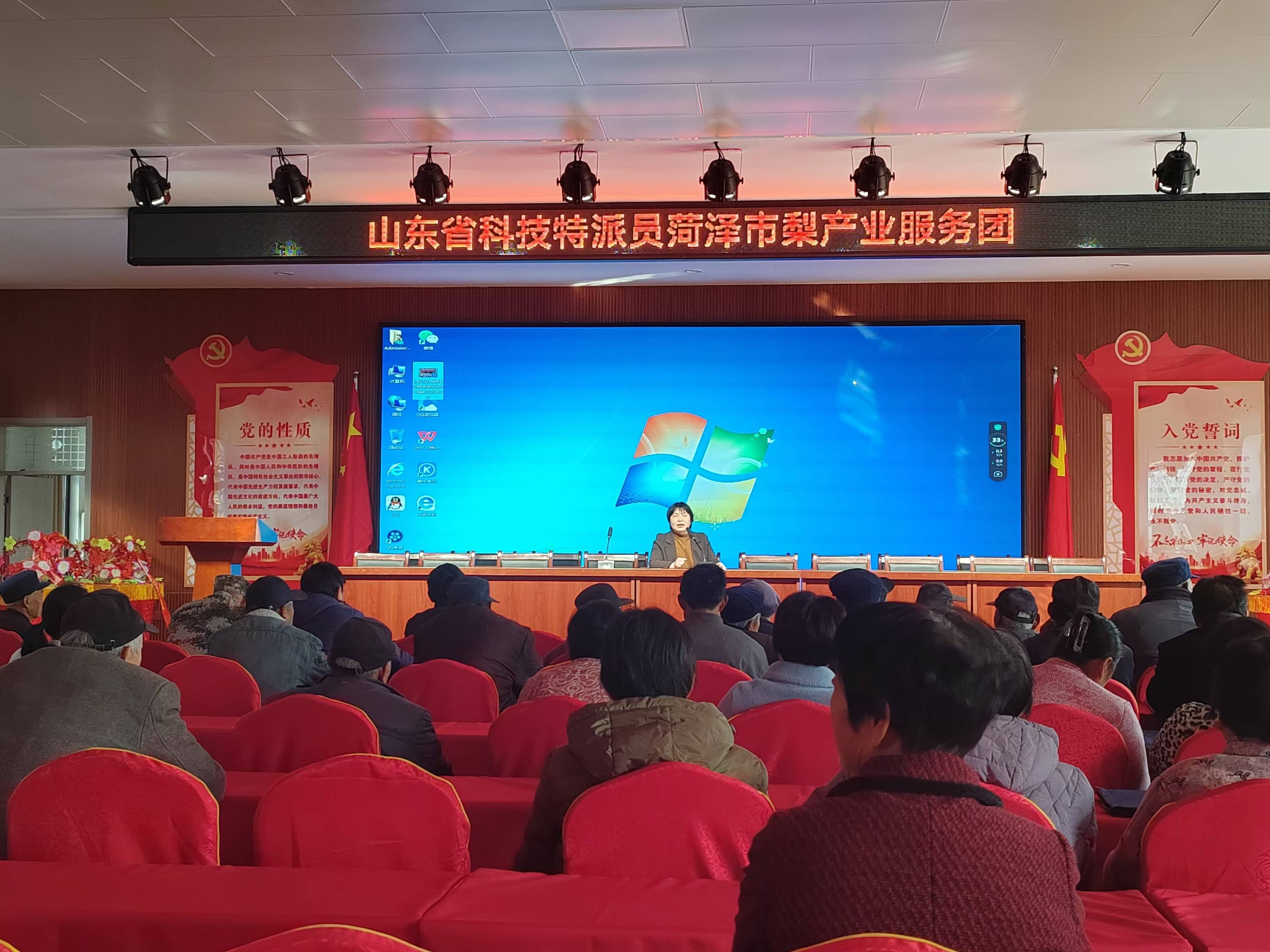此次培训采用课堂讲授的方式进行,邀请了郓城县农业局农业技术推广研究员张存库及林业局工程技术应用研究员苑秀梅共同授课,张存库研究员围绕涉农法律法规、现代农业发展、农作物高产栽培与病虫害防治技术、耕地保护与高标准农田建设等课程进行了深入浅出的讲解;苑秀梅研究员讲解了梨树管理方面的基本知识,并强调要重视有机肥的重要作用。并对梨树整形修剪、肥水管理、病虫害防治、套袋技术等经验做法,销售策略和渠道,发展前景等进行详细讲授。