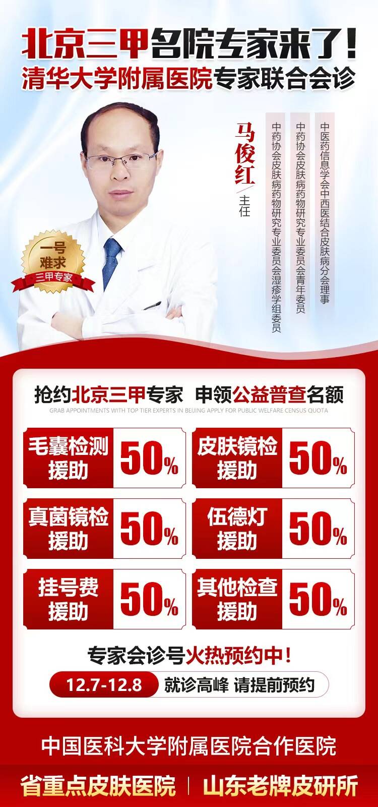 坚持把北京名医、专家请到家门口,切实解决患者看病难、找专家更难的问题。2024年12月7日-12月8日(本周末),济南肤康皮肤病医院特邀北京马俊红教授来院进行公益联合会诊。机不可失,预约从速!