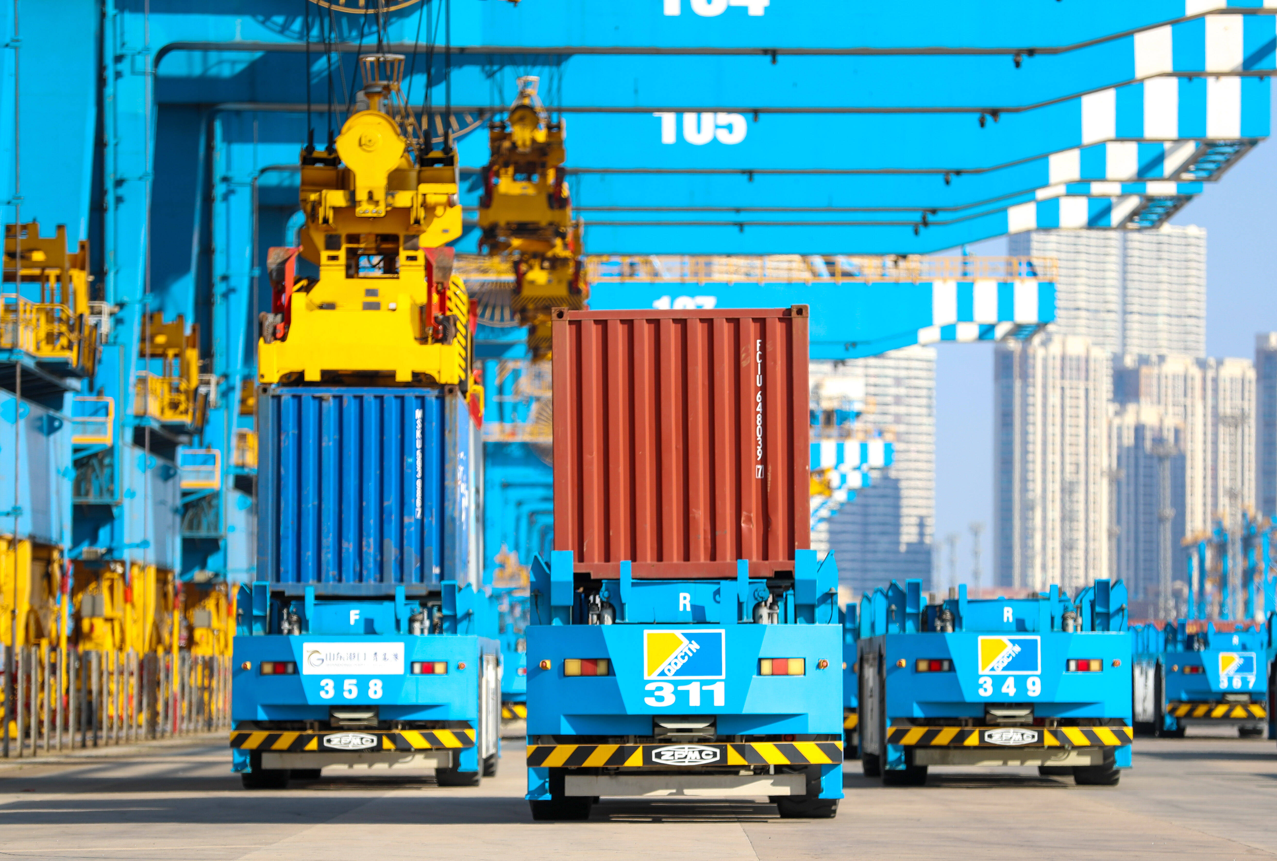 12月3日,在山东港口青岛港全自动化码头,高速轨道吊在集装箱堆场来回穿梭。