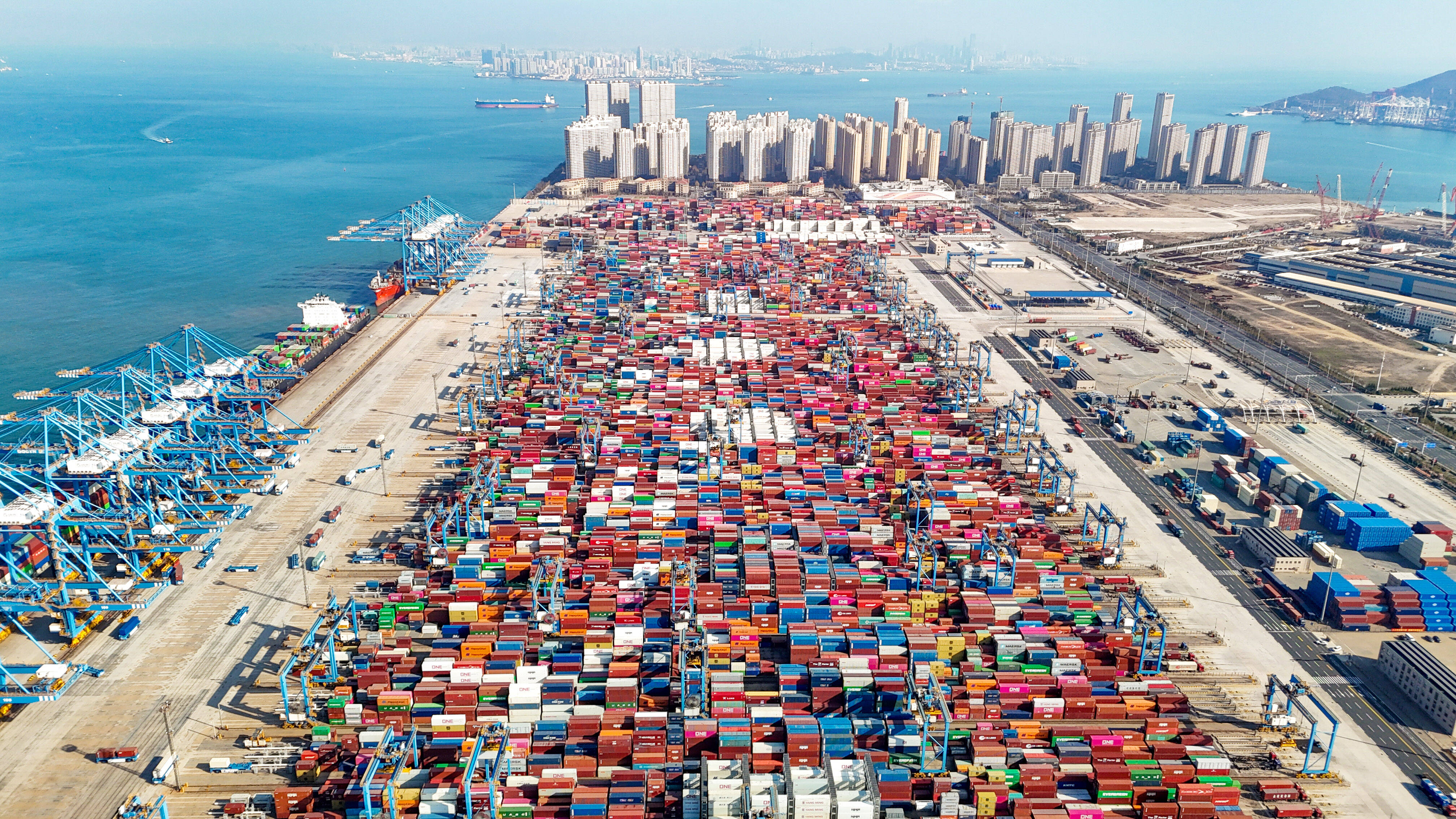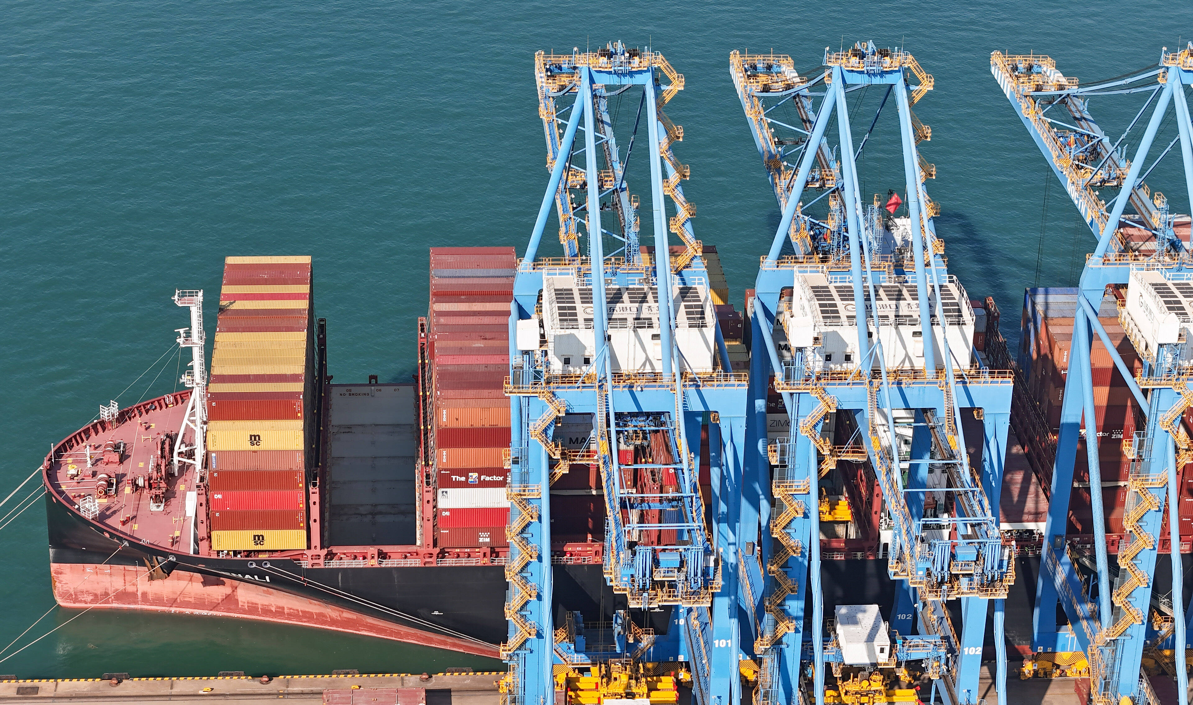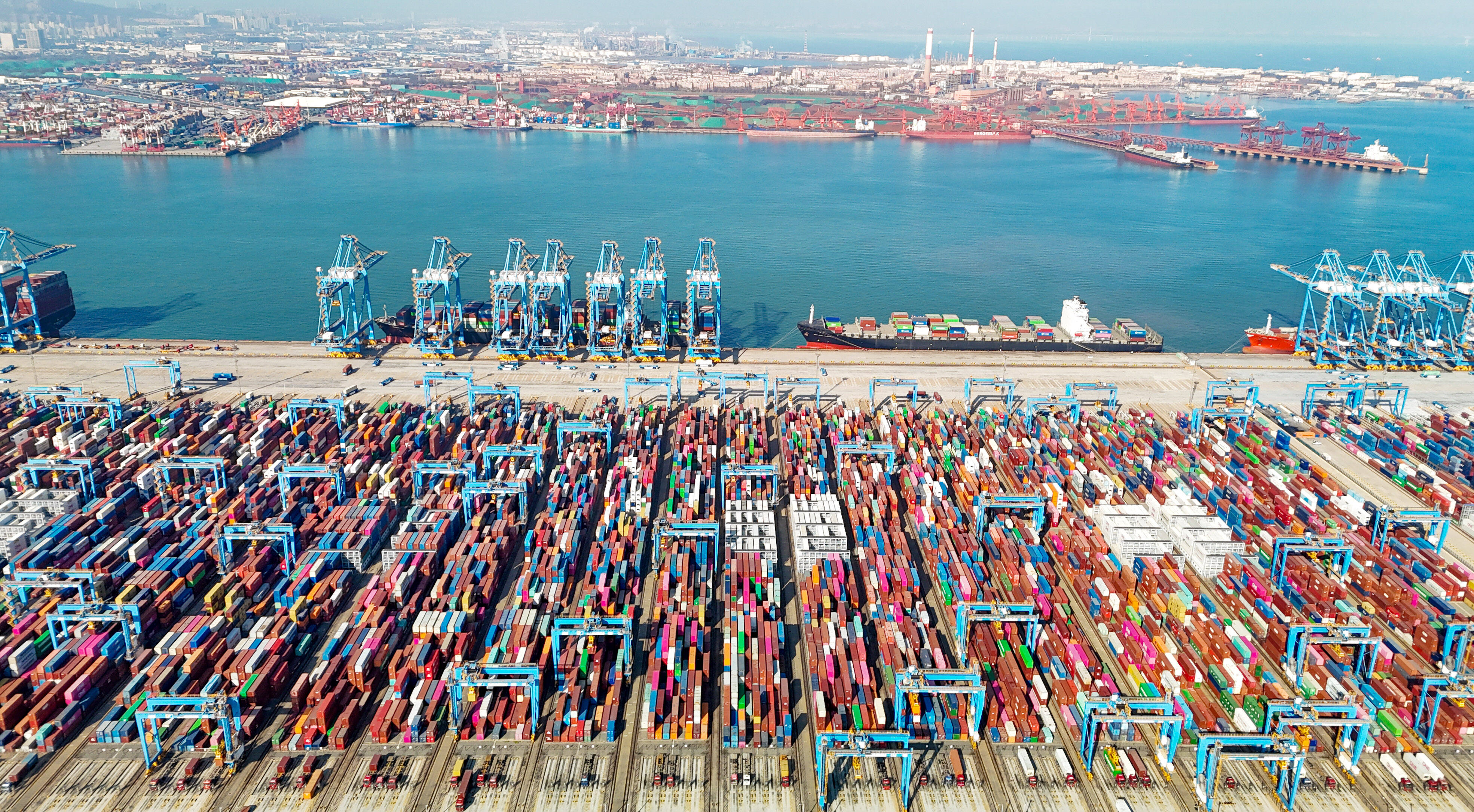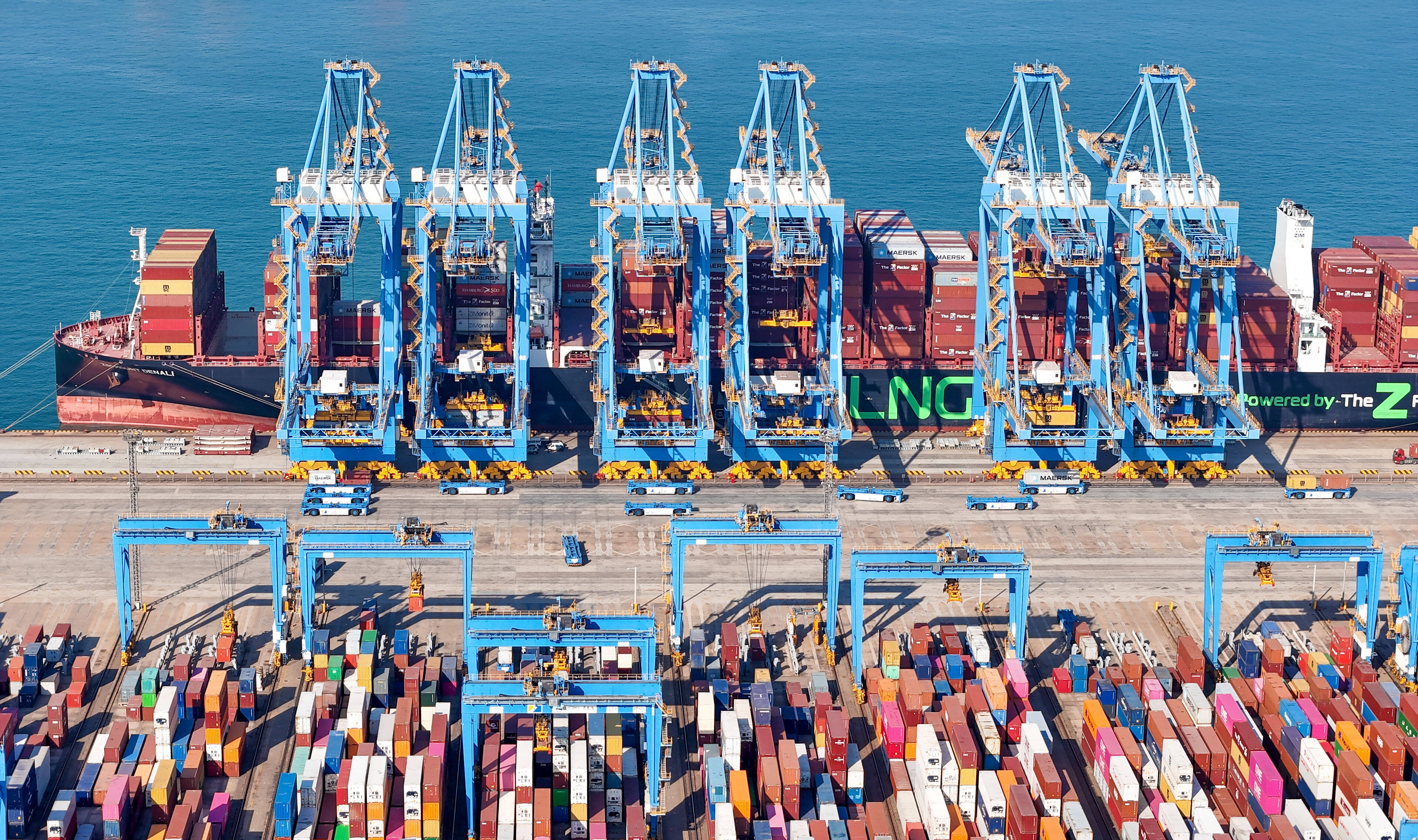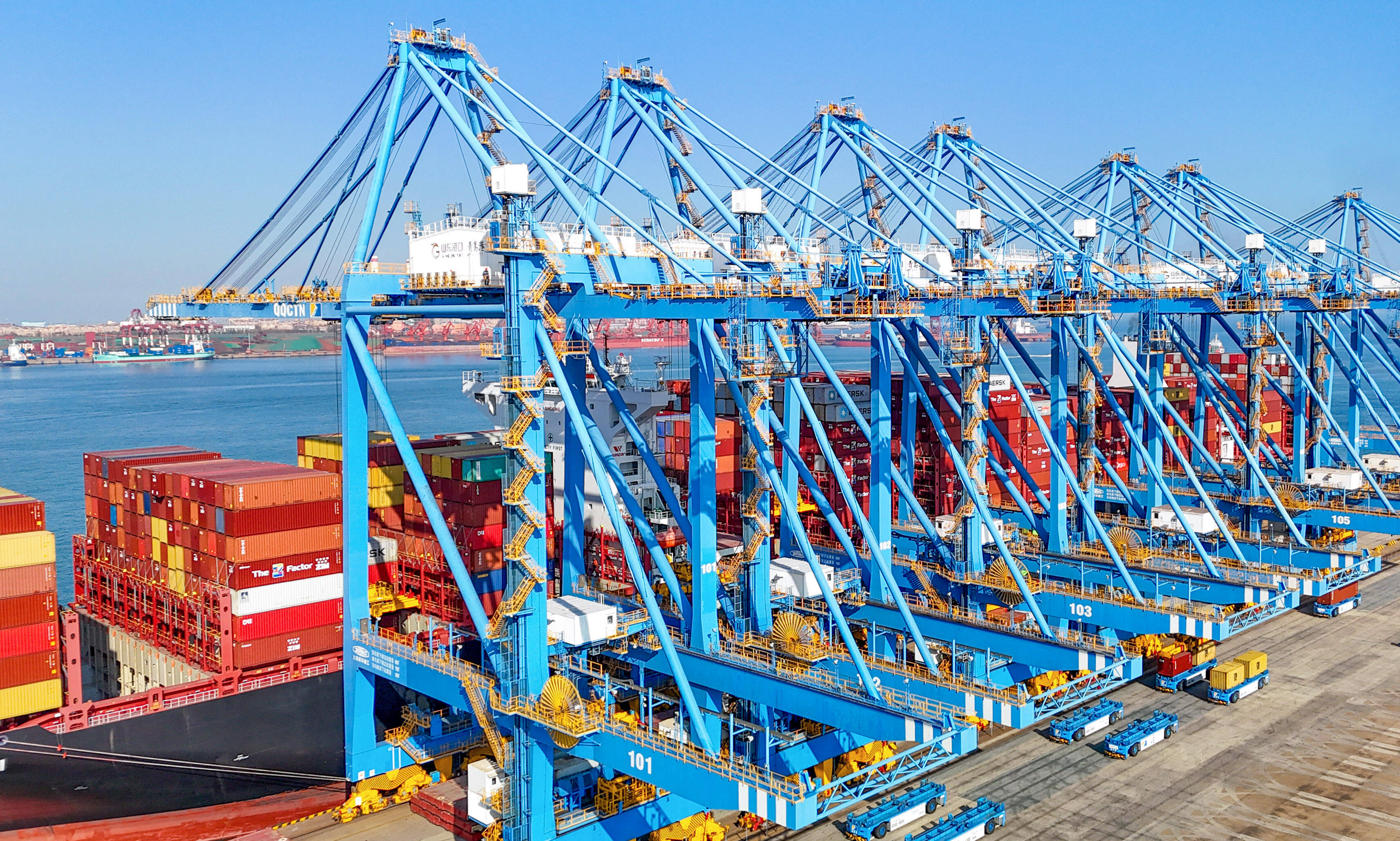 山东港口青岛港全自动化码头,在“馨城”轮作业中,自动化码头桥吊平均单机作业效率达到了60.6自然箱/小时,第十一次刷新自动化码头装卸效率世界纪录。
