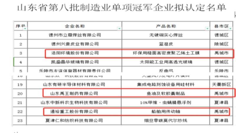 齐鲁网·闪电新闻12月9日讯 近日,山东省工业和信息化厅公布了第八批制造业单项冠军企业名单,其中德州市有23家企业入围,禹城市通裕重工、浩阳环境、禹王制药三家企业荣膺其列。