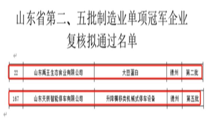 与此同时,禹王生态以大豆蛋白产品、天辰智能停车以升降横移类机械式停车设备也分别通过了全省第二批和第五批制造业单项冠军企业复核。截至目前,禹城市省级制造业单项冠军已有10家,国家级制造业单项冠军2家,总量位居德州前列。