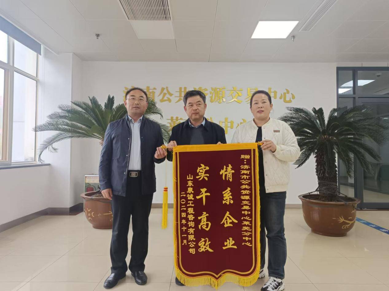 齐鲁网·闪电新闻11月18日讯 11月15日下午,山东泉城工程咨询有限公司将一面写有“情系企业 实干高效”的锦旗送至济南公共资源交易中心莱芜分中心,感谢分中心全体工作人员在交易工作中为其提供的悉心指导和优质服务。