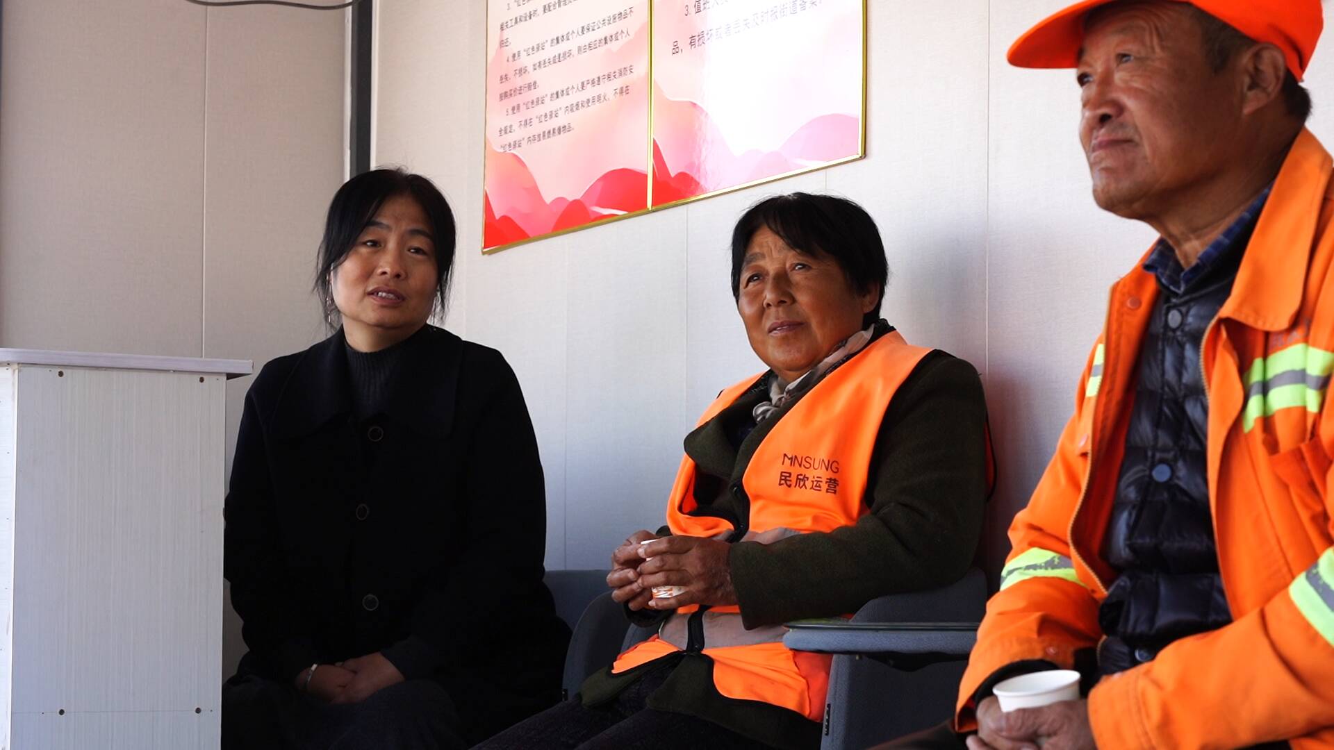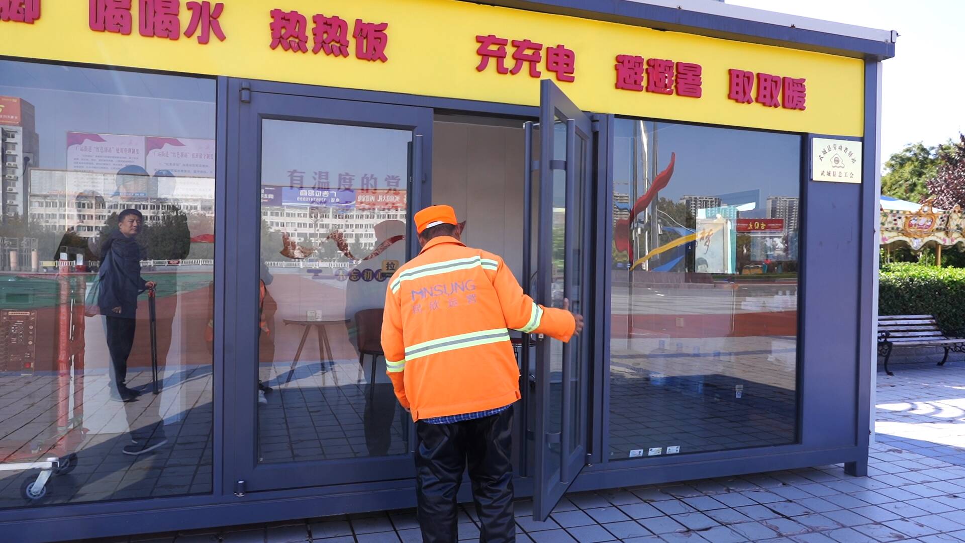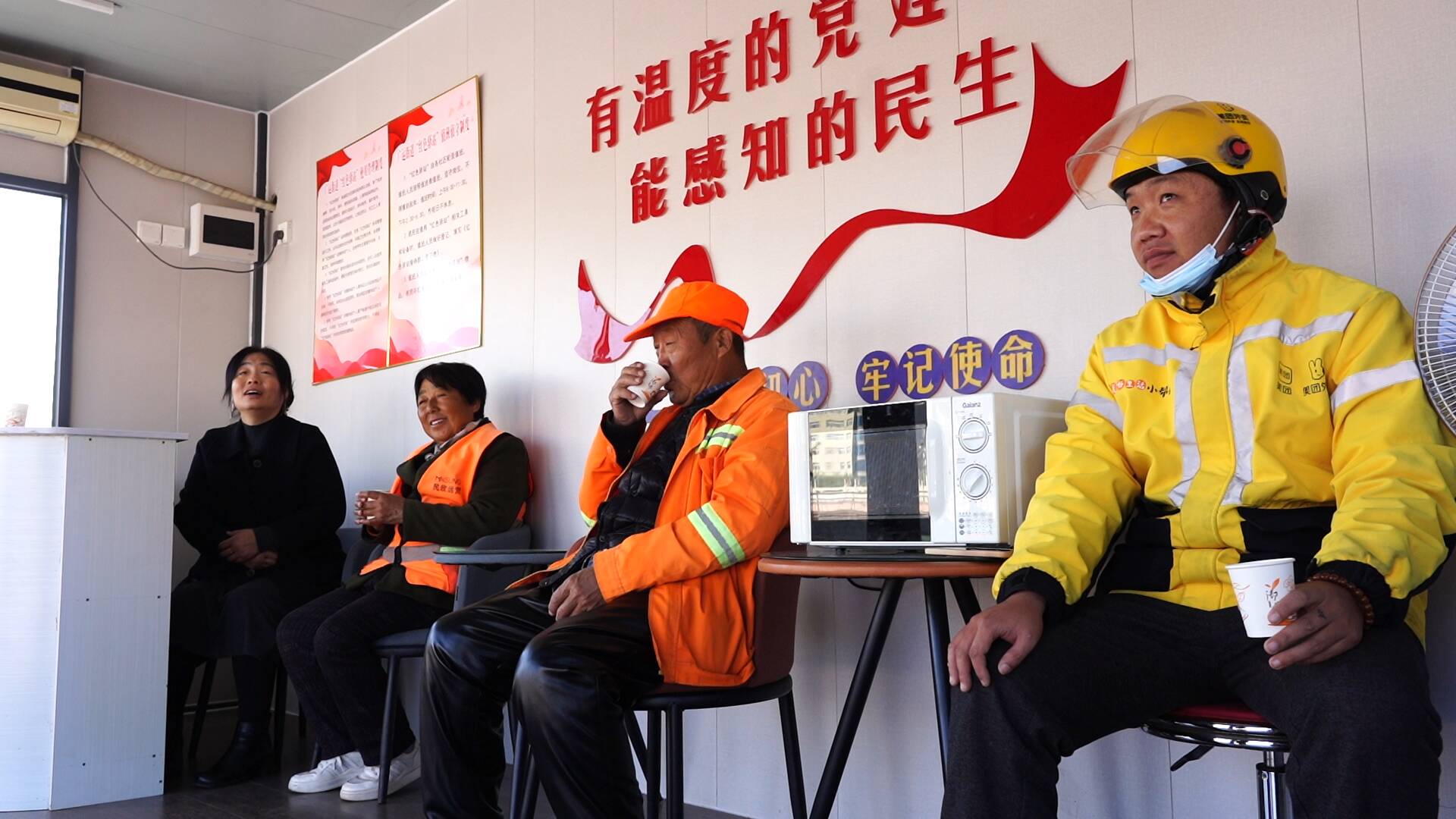 “红色驿站是聚焦快递员、外卖员、环卫工人等群体‘用餐难、喝水难、休息难’等现实问题而打造,配备微波炉、充电器、急救医药箱、雨伞。你像现在降温天气,户外劳动者就可以进来歇歇脚、暖暖身、热热饭。我们也有志愿者,在这里定期值班,为户外劳动者进行政策宣传、指路引导。”广运街道人大工委主任张虎说。