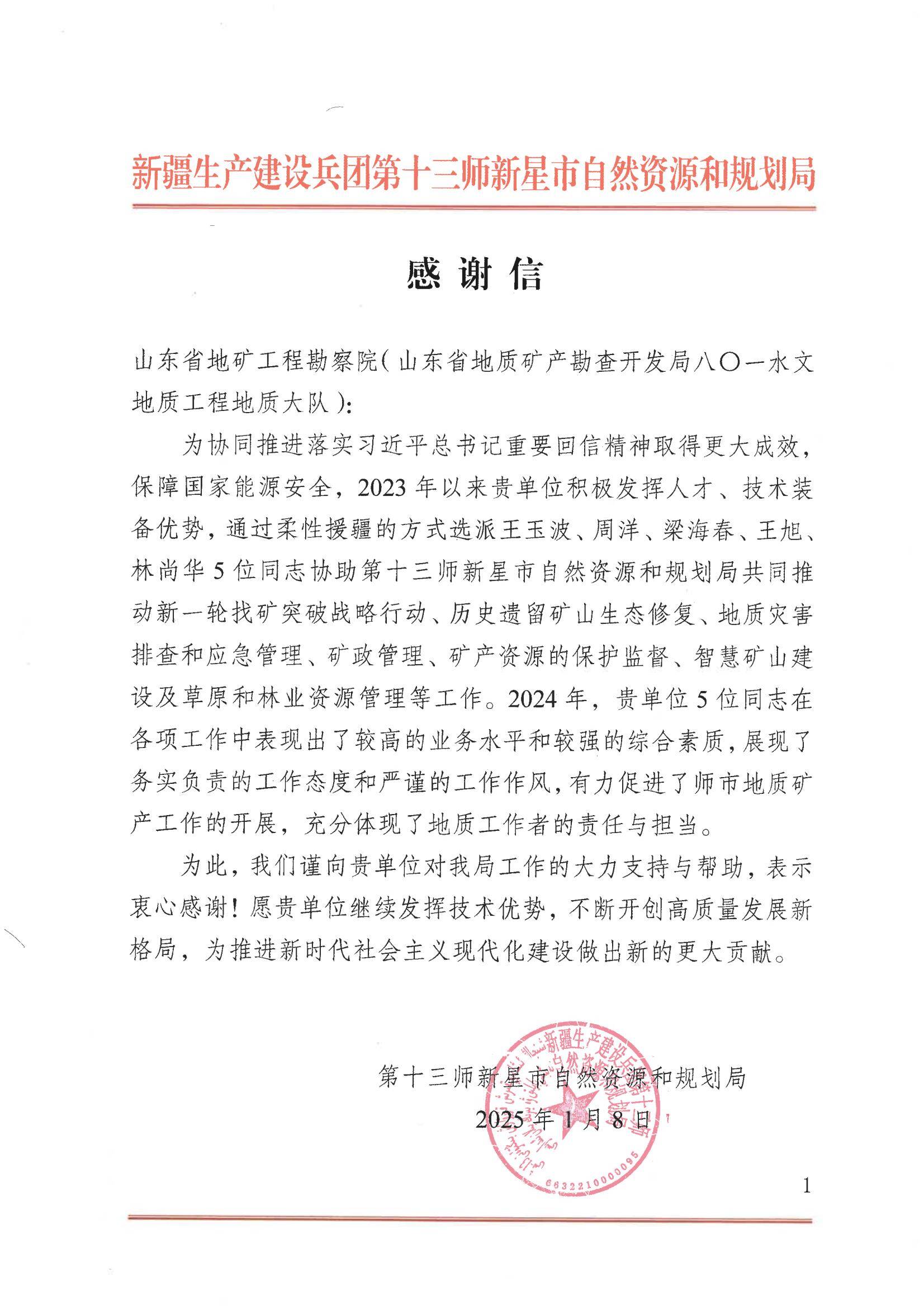2025年新年伊始,山东省地矿工程勘察院收到了新疆生产建设兵团第十三师新星市自然资源和规划局发来的感谢信,对省勘院长期以来对第十三师新星市自然资源事业的大力支持表示感谢,并对省勘院5名援疆同志助力师市开展相关工作表示高度认可。