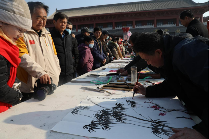 “福到啦福到啦”,文化大集上免费“售卖”春联。书法名家们挥毫泼墨,将一个个寓意新春吉祥的福字、春联和绘画作品赠予过往群众,遇到年轻人,还会加赠一副“移风易俗”主题对联,还不忘附上一句“福到啦”。市民王庆武手捧福字开心地对着镜头,“这大大的手写福字倒着贴到门上,才是‘福到了’。”翰墨飘香之间,文化味、人情味同在。摊位旁还设置了图书专区,“摊主”一边直播讲解热卖书籍,一边反转摄像头给“粉丝”朋友们记录大集上的热闹劲儿。