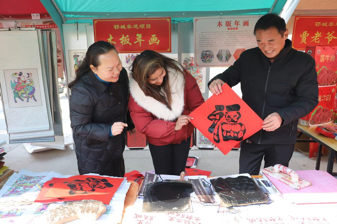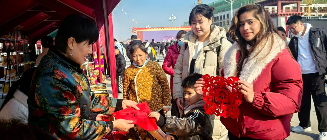 “中国的年俗文化太热闹啦,喜欢中国年”,非遗大集“圈粉”外籍友人。杨秀玲剪纸、李程漆器、黄河泥塑、木刻年画、福禄葫芦等民间非遗一一“摆摊”,吸引人们争相观看、购买。菏泽剪纸非遗传承人杨秀玲现场教授剪纸技法,众多女士围在一旁认真学习,乐在其中。来自巴基斯坦的游客Kinza学得有模有样:“我学会了剪窗花,我还要去看舞狮子,去和戏曲老师合照。”