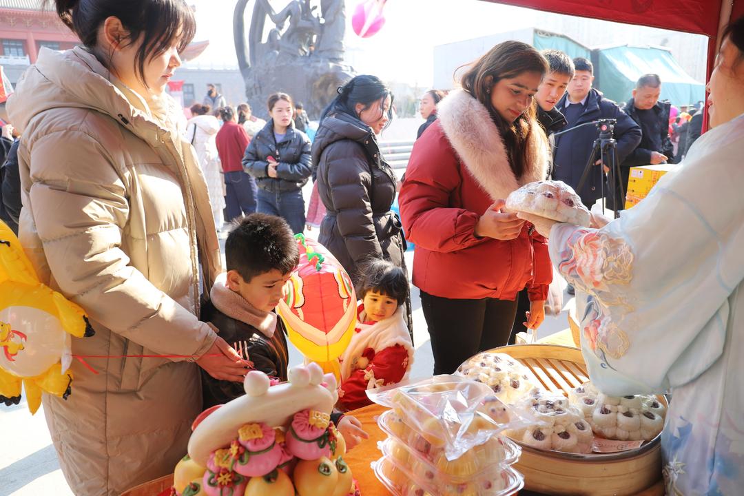 “花糕订单排到了除夕”“果子一上午卖了6000元”,年货大集里辞旧迎新“买买买”。“花馍馍”、车氏“炸果子”、毛织手工花、状元贡糖、春联等年货应有尽有;小磨香油、程屯面粉、仲堌堆西瓜酱、黄安驴肉、皮婆婆烧鸡等“郓城好品”琳琅满目;郓城壮馍、糖人、炸串、肉盒等美食小吃回味悠长。摊主的吆喝声、此起彼伏的讨价还价声以及人群里话家常的乡音把“赶年集”的氛围感拉满。“现场这一会卖了有1000块钱,主要是接的订单多,订单得忙活到除夕了。”郓城县“花糕姑娘”赵鑫忙着展示各种各样代表美好寓意的花糕。市民李女士手捧三刀、果子、蜜角等儿时记忆中的美食,脸上洋溢着幸福:“这些平时都很难买到,小时候过年必备,今天终于找回了久违的儿时味道。”车氏糕点摊主车传喜笑得合不拢嘴:“老工艺不能丢,这一上午就卖了六千多元,‘甜甜蜜蜜’开门红啊!”