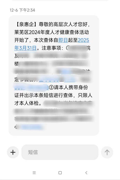齐鲁网·闪电新闻12月15日讯 “尊敬的高层次人才您好,莱芜区2024年度人才健康查体活动开始了……请本人携带身份证并出示本条短信进行查体。”12月6日,莱芜区持卡高层次人才收到了“泉惠企”平台发送的查体通知,实现了高层次人才医疗保障政策“免申即享”。