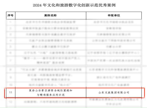 近日,山东文旅集团“复杂山岳景区游客全域位置感知与精准服务应用示范”成果先后成功入选文化和旅游部“2024 年文化和旅游数字化创新示范优秀案例”和“2024 年新质生产力赋能旅游集团创新范例”,赢得行业和社会广泛认可。