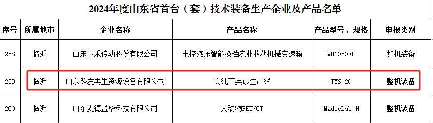 临沭融媒讯 近日,山东省工业和信息化厅公布了2024年度山东省首台(套)技术装备生产企业及产品名单,临沭县山东路友再生资源设备有限公司的高纯石英砂生产线成功入选。首台(套)技术装备不仅具有极大的市场潜力,同时也是衡量企业核心竞争力,体现制造业高质量发展水平的重要标志之一。截至目前,临沭县省级首台(套)技术装备及关键核心零部件总数达到16项。