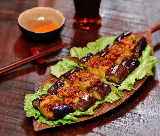 ● 茄子对半切开铺上蒜蓉后,适当用筷子戳一下,更好入味。