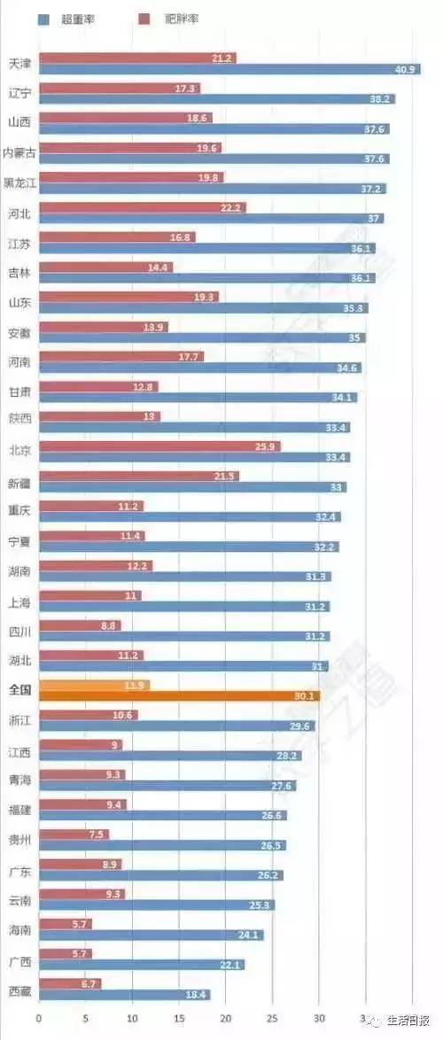 天津以40.9%的超重率领先全国,