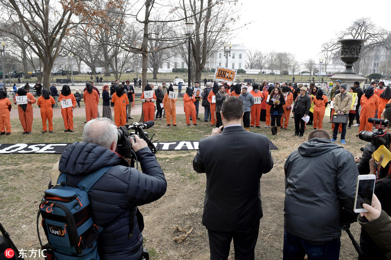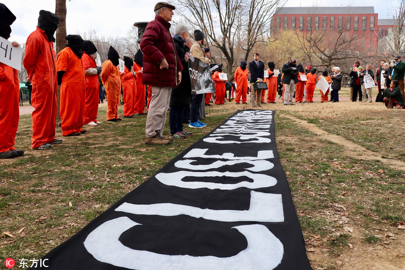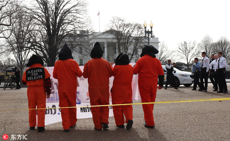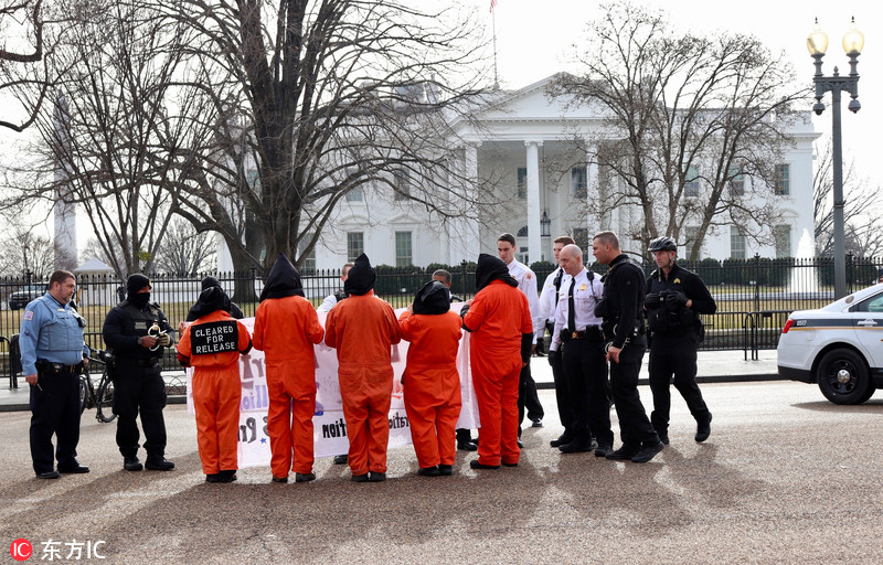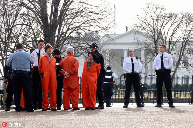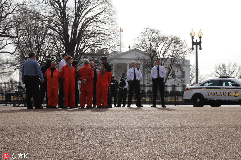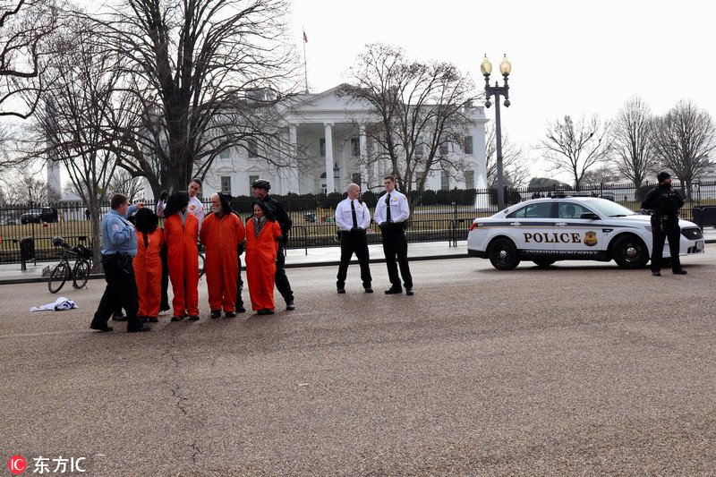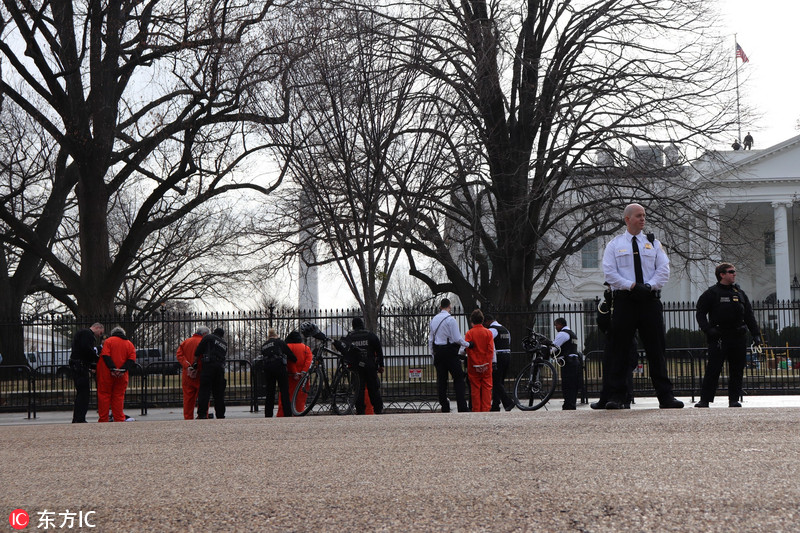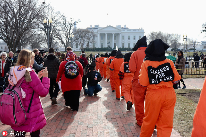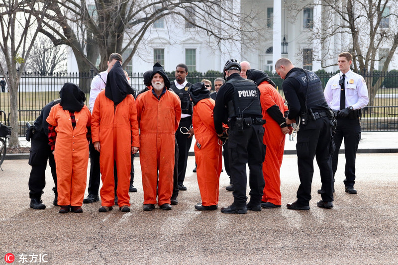 当地时间2018年1月12日,美国华盛顿,民众扮成囚犯的模样,要求关闭关塔那摩监狱。据悉,关塔那摩监狱是美国军方于2002年在古巴关塔那摩湾海军基地所设置的军事监狱。