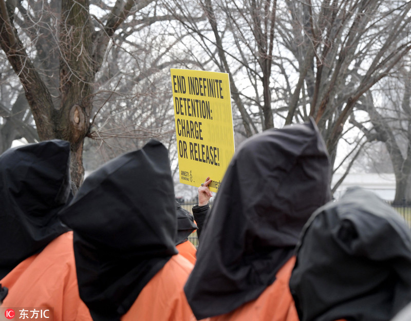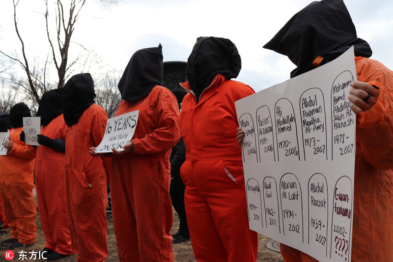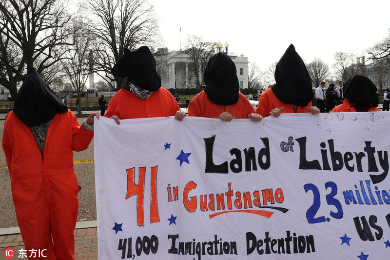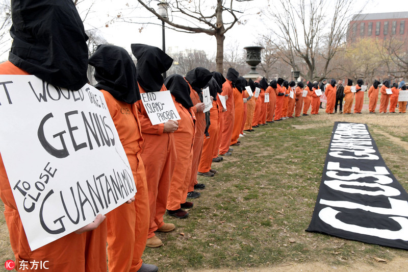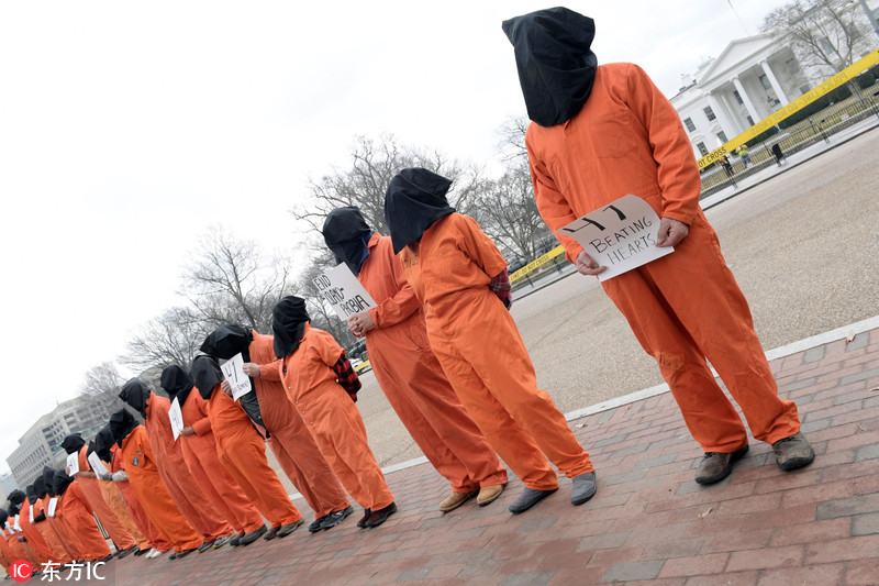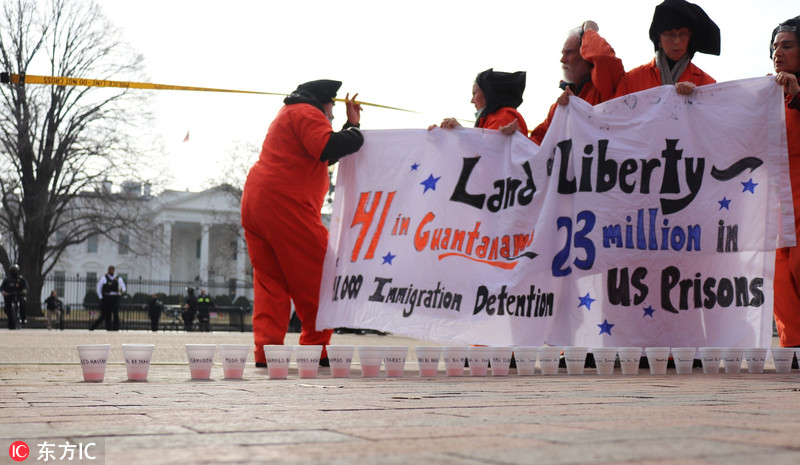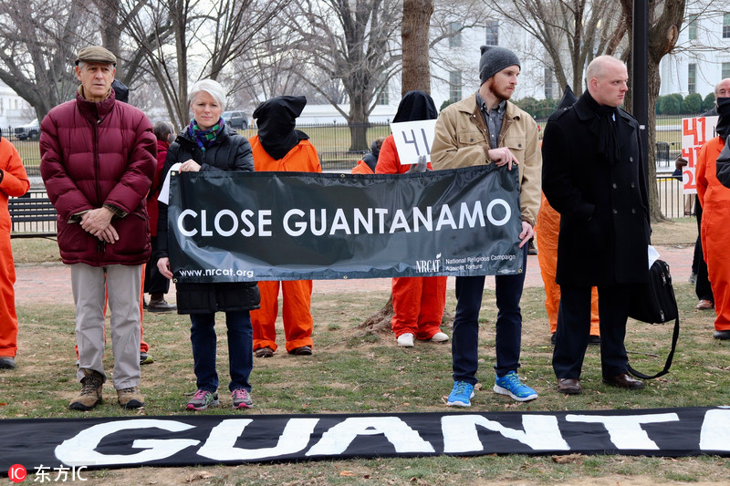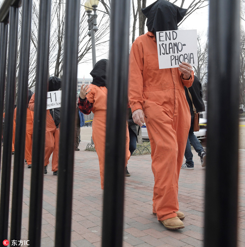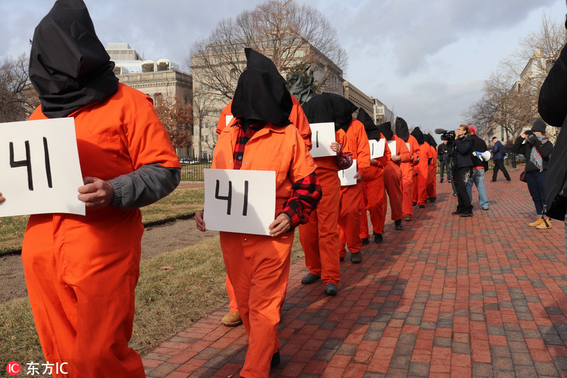 当地时间2018年1月12日,美国华盛顿,民众扮成囚犯的模样,要求关闭关塔那摩监狱。据悉,关塔那摩监狱是美国军方于2002年在古巴关塔那摩湾海军基地所设置的军事监狱。