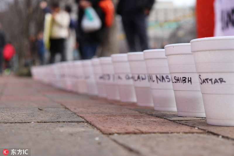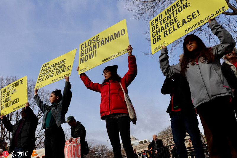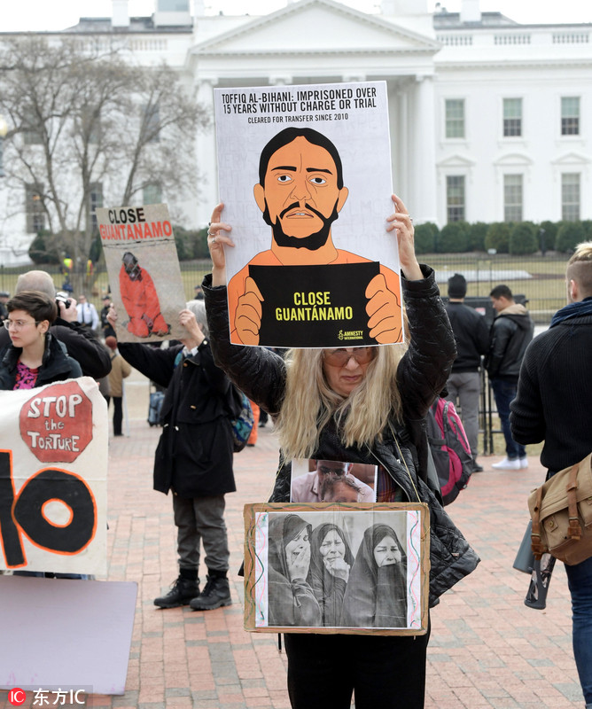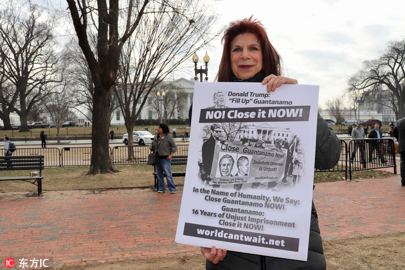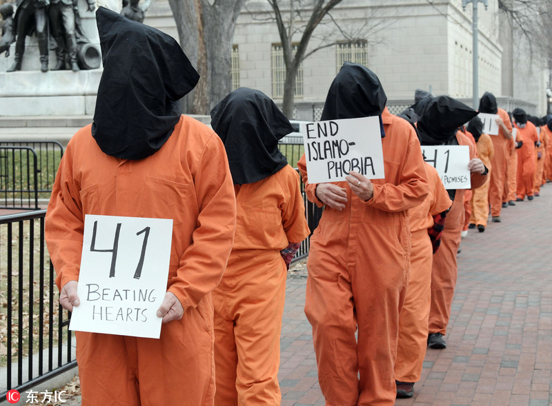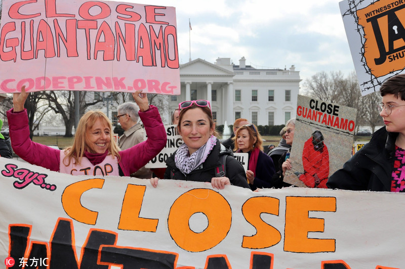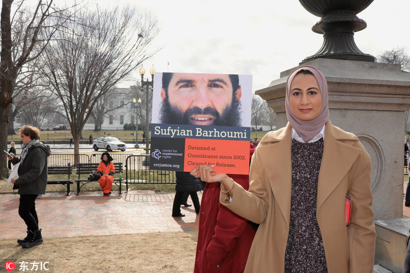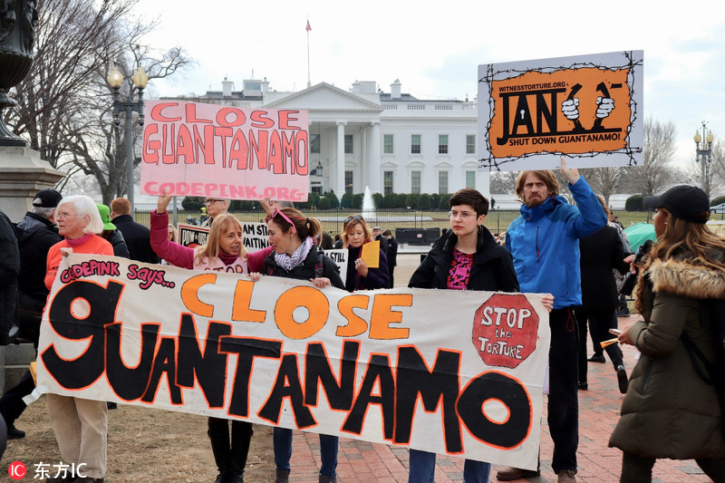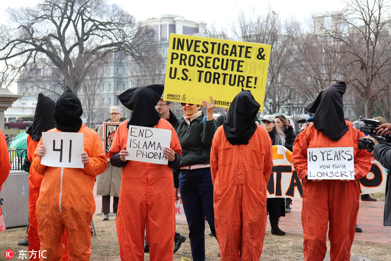 当地时间2018年1月12日,美国华盛顿,民众扮成囚犯的模样,要求关闭关塔那摩监狱。据悉,关塔那摩监狱是美国军方于2002年在古巴关塔那摩湾海军基地所设置的军事监狱。