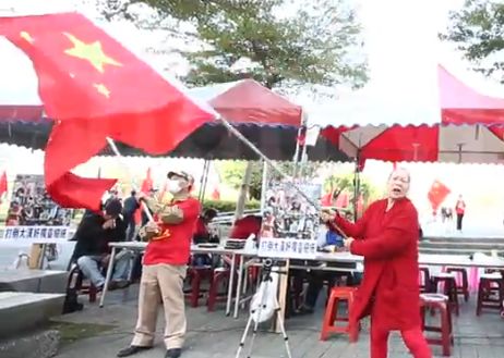 今天民进党部前公园,有如插满五星旗的西门町街头再现,爱国同心会不仅搭帐棚、吃便当,还挂上“两岸一家亲”、“只要对台湾人民好坚决支持一国两制”等标语,台湾“爱国同心会会长”周庆峻表示,这次他们准备了一百面的五星旗。