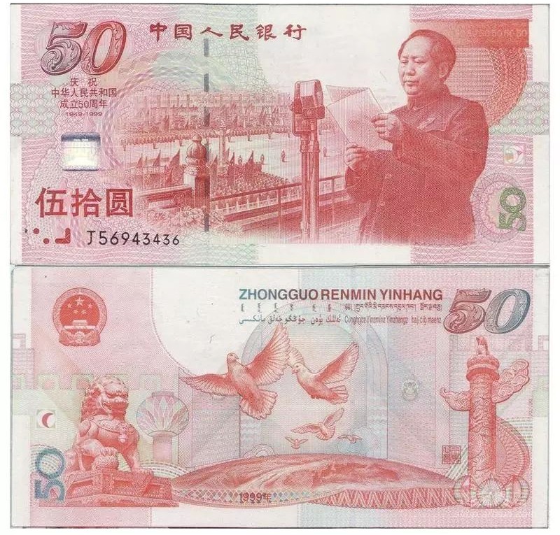 资料显示,中国人民银行在1999年曾面向全国发行“中华人民共和国成立五十周年”纪念钞,面额为50元。