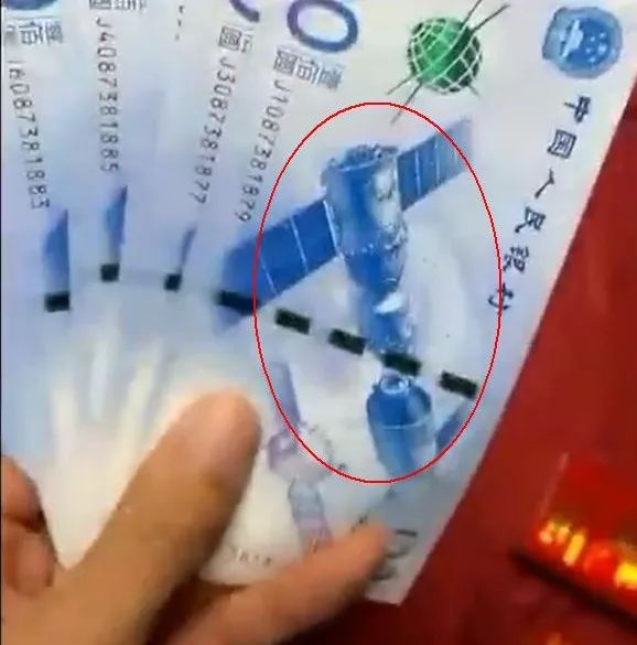 网传视频的定格画面还显示,蓝色的100元纸币上印着卫星图案,正是中国人民银行于2015年11月26日发行的中国航天纪念钞,面额为100元。