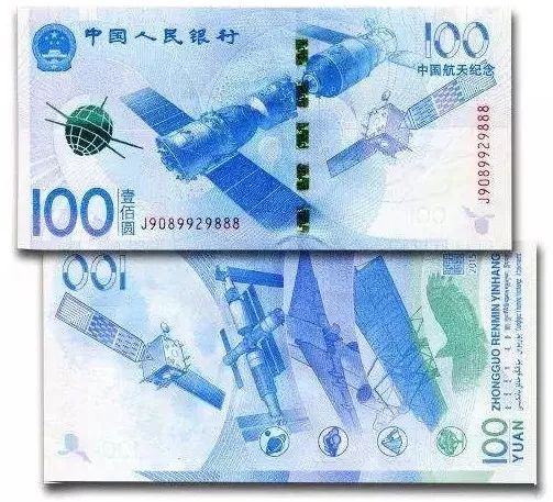 该纪念钞主色调为蓝色,图案包括东方红一号卫星、神舟九号、天宫一号、嫦娥卫星等。