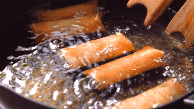 ●将馅料裹入春卷皮,包成长条状封口,入四成热锅炸至色泽金黄即可。