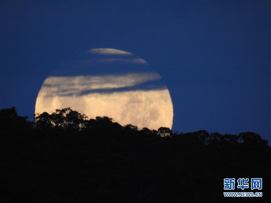 1月31日晚,月亮从澳大利亚堪培拉的黑山上升起。当晚,“超级月亮”现身澳大利亚首都堪培拉。 新华社发(钱军摄)
