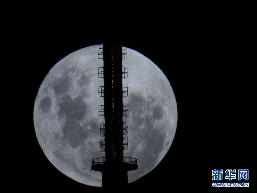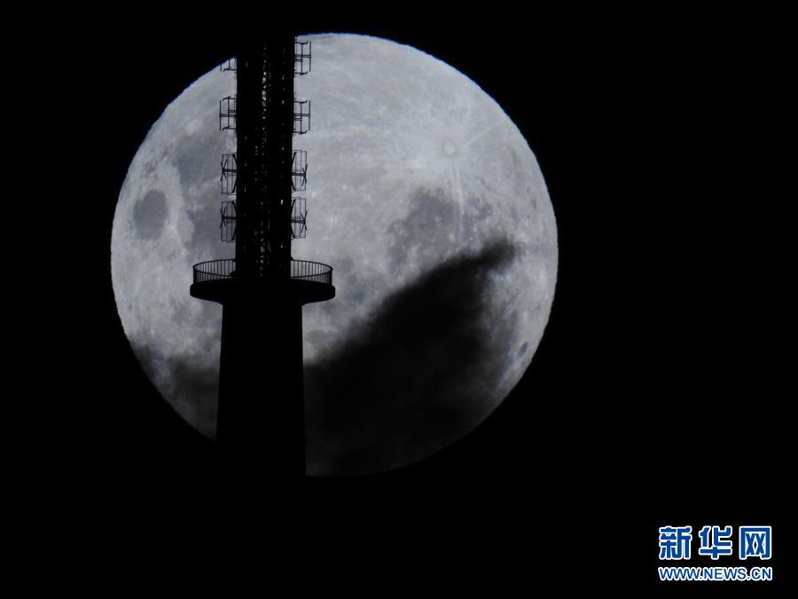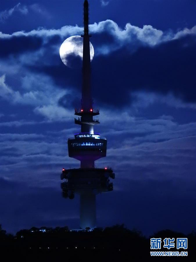 1月31日晚,月亮从澳大利亚堪培拉的黑山电视塔后升起。当晚,“超级月亮”现身澳大利亚首都堪培拉。 新华社发(钱军摄)