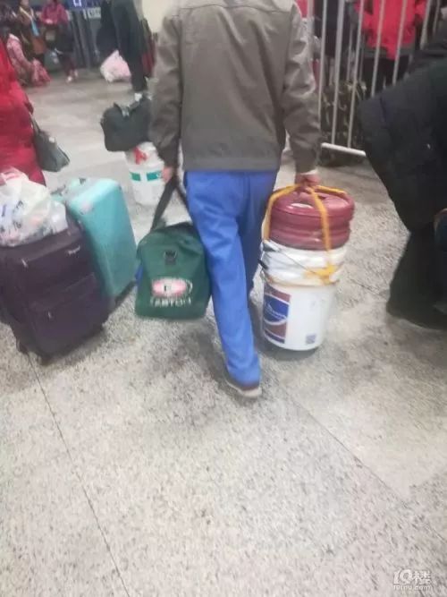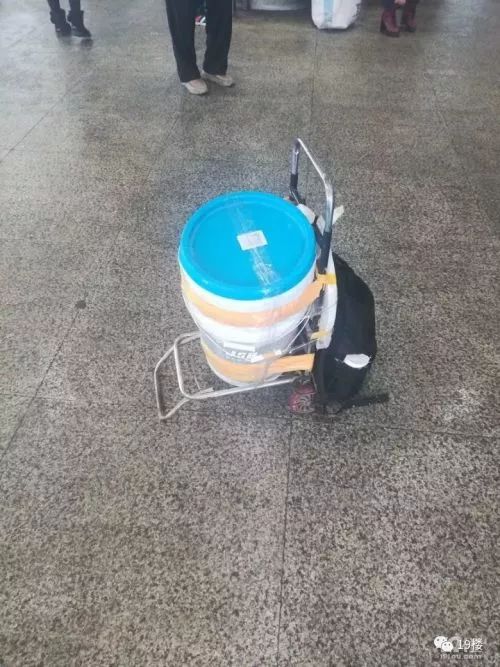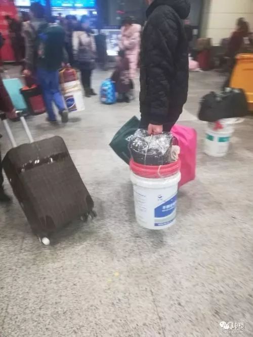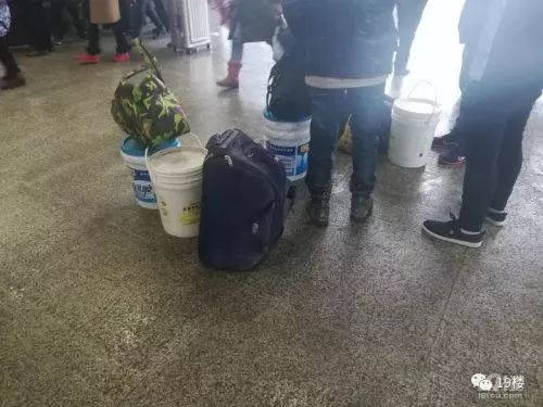 杭州网友“小小草”发现了一个有趣的现象:火车站里,有许多拎着涂料桶回家的乘客,而拎这个千里迢迢回家的人非常普遍,一位候车小哥甚至带了30多个这样的白色涂料桶回家!