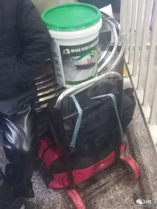 旁边那位师傅,一看也是工地上的,他绑在行李箱上的水平尺,应该是铺装瓷砖大理石的工具。他也带了三个涂料桶,其中一个桶上绑着一口高压锅。