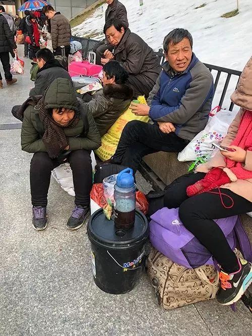 在湖州做童装生意的王大姐也带了两个涂料桶,她老家贵州遵义,两口子从湖州坐大巴来到杭州买火车票,如果买不到坐票,两个桶就是他们俩这一路的座位,不然站着回老家要31个小时!涂料桶里装满东西,王大姐好不容易打开一个桶盖给我看,里面有苹果、辣条和餐巾纸。