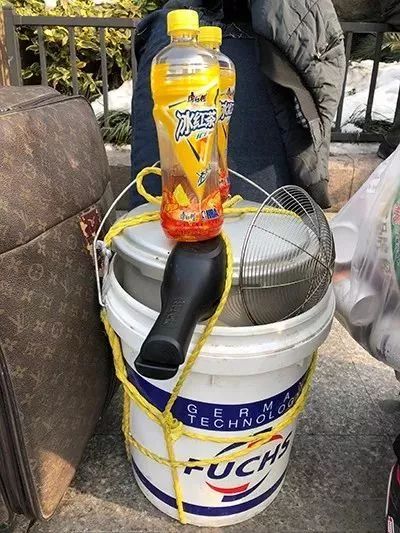 刘师傅的两个桶都没闲着,一个当便携式桌子使,上面放了两瓶饮料,另一个拿来固定高压锅,下面还垫了两双鞋,绝对结实。