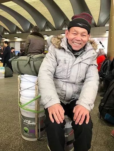 陈大姐旁边站着的,是河南老乡柴师傅,他行李箱上绑了一个红塑料桶,柴师傅说是他花13块钱买的,干净漂亮,但和涂料桶比,显得又脆又薄,根本不敢坐上去。