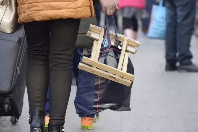 【马扎】2017年春运已于1月13日拉开帷幕,随着春节的临近,归乡潮正在渐渐到来。1月15日,记者走访北京西火车站看到各年龄,各行业的人们汇聚到车站,准备回家过年。而人们的行李却大相径庭,有塑料桶,牛仔背包,拉杆箱,编织袋,包装盒,马扎等。图为游客手提木制马扎赶火车。