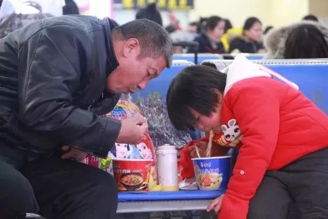 【方便面】2017年1月14日,青岛火车站候车室里5岁的萱萱跟姥爷一起吃方便面,当天早上6点萱萱跟姥爷从烟台出发,经青岛转车后,还要坐两天两夜的火车去广西南宁跟爸爸妈妈团聚。山东省青岛市各大高校放假,青岛火车站迎来春运学生返乡高峰,以至于整个候车厅人满为患,等候上车的学生从候车室排到了进站大厅。张富红/摄